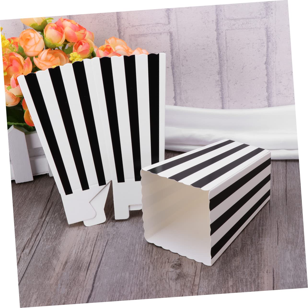 Package Include 240 * Popcorn Boxes Holder Containers Cartons Paper Bags Stripe Box for Movie Theater Dessert Tables Wedding Favors (Black) Characteristics - Color: Box. - Material: Paper tall white snack boxes. - Size: 11.50X7.00X11.50cm/4.52X2.75X4 ornament container. - Wide applications: Fill with popcorn, , candy, cookie for convenient snacking or incorporate into festive table decorations Popcorn Cartons. - all kinds of parties, picnics and movie night, wedding favors. Also, can fill the boxes with party favors for guests to take home at the end of the celebration disposable. - You can make your DIY labels to stick on the popcorn boxes for any special occasion popcorn machine. - Boxes are folded so they will store easily black popcorn box.Goods Informationcandy popcorn It does be a practical storage accessory in many occasions.disposable containers It is covered with stripe patterns and designed with wavy edge.paper popcorn cups This item is manufactured for holding snacks expecially popcorns.striped popcorn container The cardboard that it adopts is up to food-grade level, so it is safe and to store food