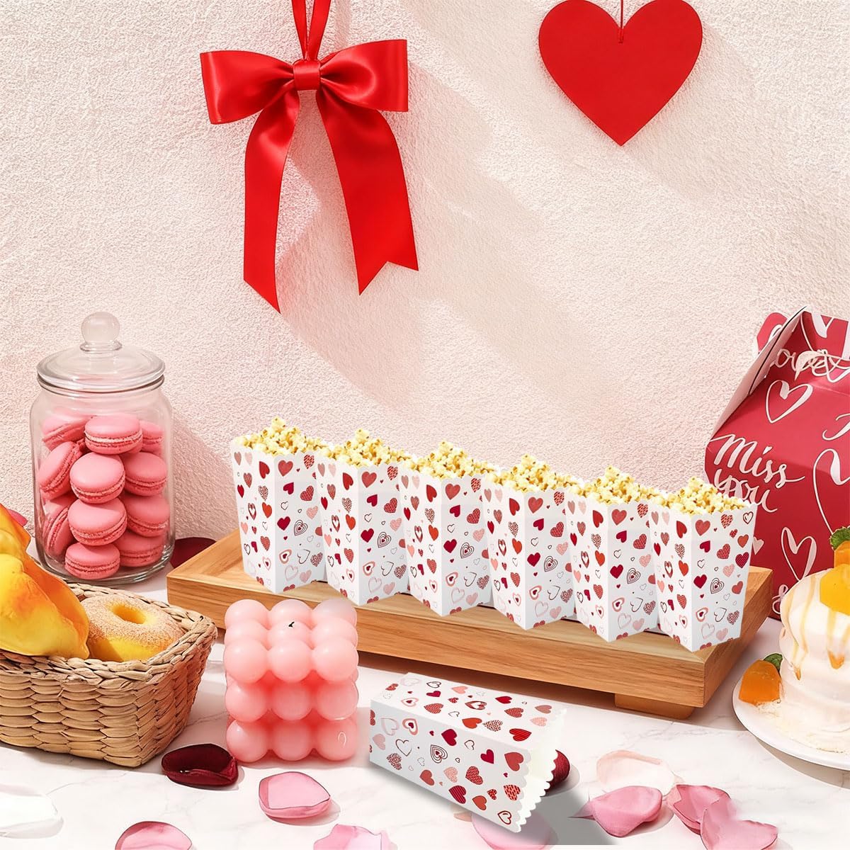 Add a charming touch to your special celebrations with these delightful heart-patterned popcorn boxes. The set includes 24 beautifully designed containers featuring an array of red and pink hearts in various artistic styles on a crisp white background. Perfect for Valentine's Day parties, weddings, movie nights, or birthday celebrations, these mini popcorn boxes combine functionality with festive flair. Each container is sized just right for individual servings, making them ideal for convenient snack distribution at any gathering. The sturdy construction helps keep popcorn fresh and contained, while the attractive heart motif creates an appealing presentation that guests will love. These versatile containers can also be used to serve other treats or as decorative party favor boxes. Transform your event's snack station into an eye-catching display with these romantic and practical popcorn boxes.