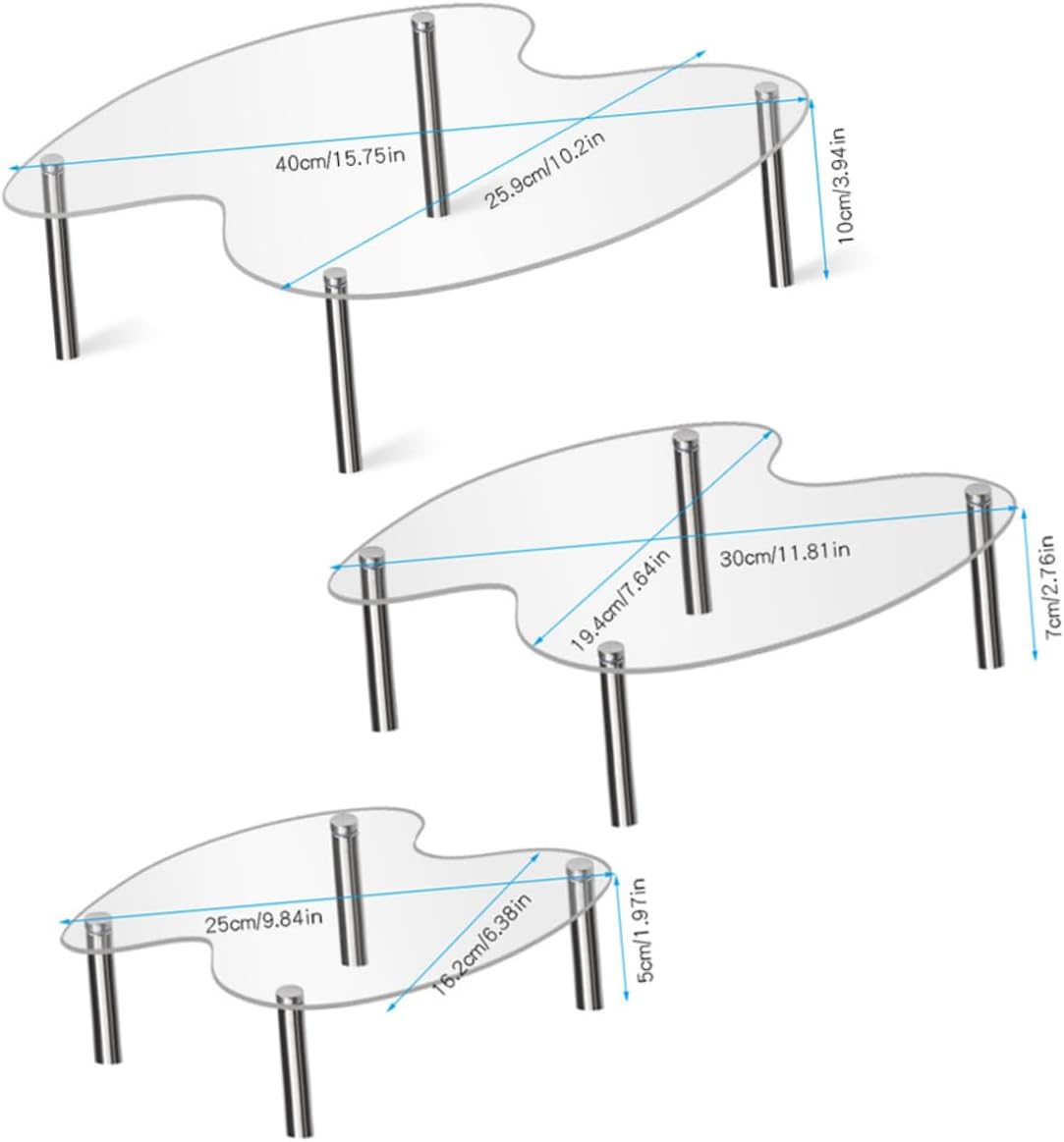 Package Include 3 x Display Stands Characteristics -Material:Acrylic,Metal stand organizer for dresser -Size:25.00X16.20X5.00cm/9.82X6.37X1.97in clear cake stand -Size:30.00X19.40X7.00cm/11.79X7.62X2.75in display stands -Color:Transparent cake stands for dessert table -Size:40.00X25.90X10.00cm/15.72X10.18X3.93in organizer - Made of acrylic material, and for long serving time. Pretty create additional storage space throughout the home storage shelf. - Compact size, without taking up too much space when using display stand. - Creative acrylic display rack is convenient and smooth, which is very easy to clean with a cloth doll storage rack. - Three layers, big enough space to organize small collections, makeup, skin care, jewelry and rubber bread dessert display stands. - characters, dolls, statues, 3D models, product , collectibles acrylic stand.Goods Informationstorage container wanna buy a doll storage rack? This product can help you keep your doll in order.acrylic riser display shelf Let your home warmer and more comfortable.skincare shelf You can place your sundries, such as cosmetics, , etc in a tidy way. display It must be one of your choices