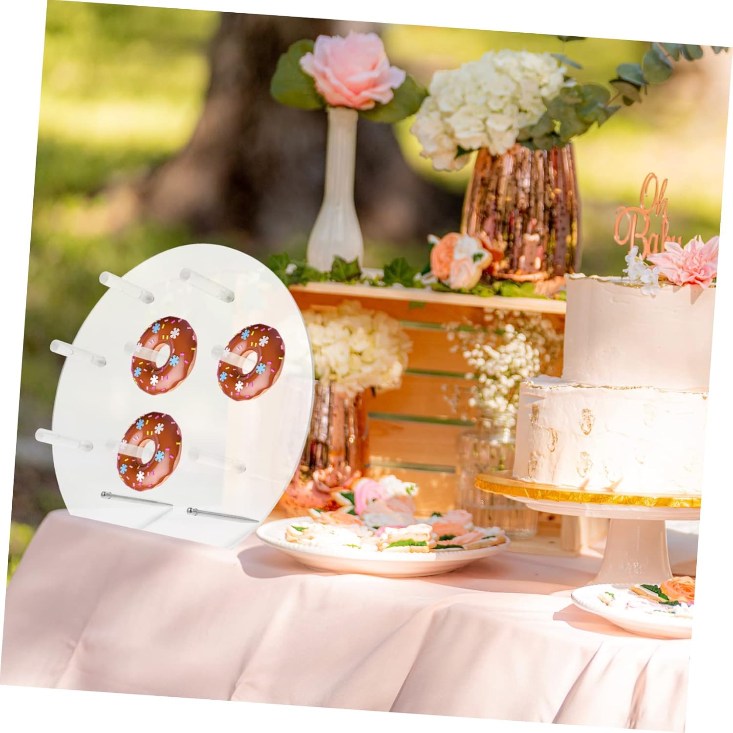 Package List 1 x donuts board 8 x storage pillars 2 x brackets Characteristics -Size: About 3000X2650X670cm/1179X1041X263inch Donuts Clear Stand. -Color: White Donuts Storage Stand. -Material: Acrylic Clear Donuts Stand. -Made of quality material with sturdy construction, can be used to classified doughnut and other desserts Donuts Clear Wall Stand. -The elegant and modeling makes sure that it will be the attractive decoration in any occasion Doughnut Stand. -It can be used with confidence and can be cleaned for reuse, easy to install and store Acrylic Donuts Stand. -Wide range of uses, suitable for banquet, birthday party, holiday parties, wedding, etc Donuts Acrylic Wall Stand. -Not only can be used as a desserts rack, but also storage rack for your cherish jewelries Acrylic Donuts Display Stand.Goods DescriptionAcrylic Donuts Rack Made from material, easy to install and can stand on dessert table firmly, will not easy to damage and break.Doughnut Stand Suitable for most of parties, such as wedding, banquet, etc.Acrylic Donuts Display Stand Help to organizing the doughnuts, make the party more unique.Donuts Clear Stand This practical doughnuts stand is for any party or celebration use