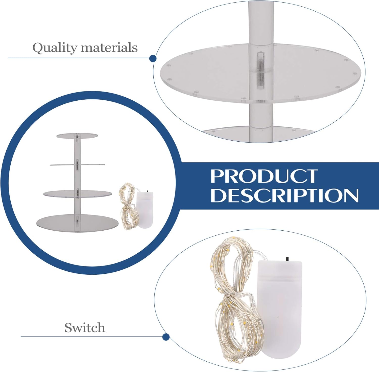 Package List 1 x 4-layer cake showing rack 1 x string light Characteristics - Material: Acrylic, Metal pedestal cake stand - Size: About 30 x 30 x 30.5cm/11.79 x 11.79 x 11.99inch display stand - Color: Transparent round cupcake tower stand - 4-layer design, which offers you more room to display your cake cake cupcake stands. - The stand is made of , which can withstand the lasting use cake risers for displays. - Features the string light design, which is unique and creative multi layer cake tray. - The stand can be used for the wedding, birthday party, family gathering, etc risers for display round cake. - It comes with the transparent appearance, which is elegant and beautiful cake stand round.Goods Informationmulti layer cake tray Simple yet style design looks elegant and , and is and stable enough to hold the cake.cake stand round Try this cake display stand! Place your cake or dessert on this shelf, and your guests will adore this masterpiece in your celebrations as they help themselves to delicious cake! for wedding, birthday, etc