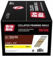 Product Description Grip-Rite GR08R Cooler Round Head 2-3/8-Inch by .113-Inch by 21 Degree Plastic Collated Vinyl Coated Framing Nail (5,000 per Box) From the Manufacturer 21° Stick Framing Nails - Plastic Collated - Primary applications include Framing, Sheathing, Subfloors and Roof Decking where corrosion protection is NOT NEEDED. Vinyl coated for easier driving and superior holding power. Full round head for added pull through strength. Designed for use in these tools: Bostitch N95RHN, N90RHN, N95-162, N88RH; Dewalt D51845, D51844; Hitachi NR83A, NR83A2, NR90AC, NR90AC2; Max SN890RH, SN80, SN90; Paslode 5325SRH, 5350/SRN-20. F350RH; Porter Cable FR350NC, FR350MAG, FR350, FR350A; Senco SN60, SN65, SN65C, FramePro 602,650,652,702XL and 752XL and many others. Grip-Rite® brand fasteners from PrimeSource Building Products, Inc.