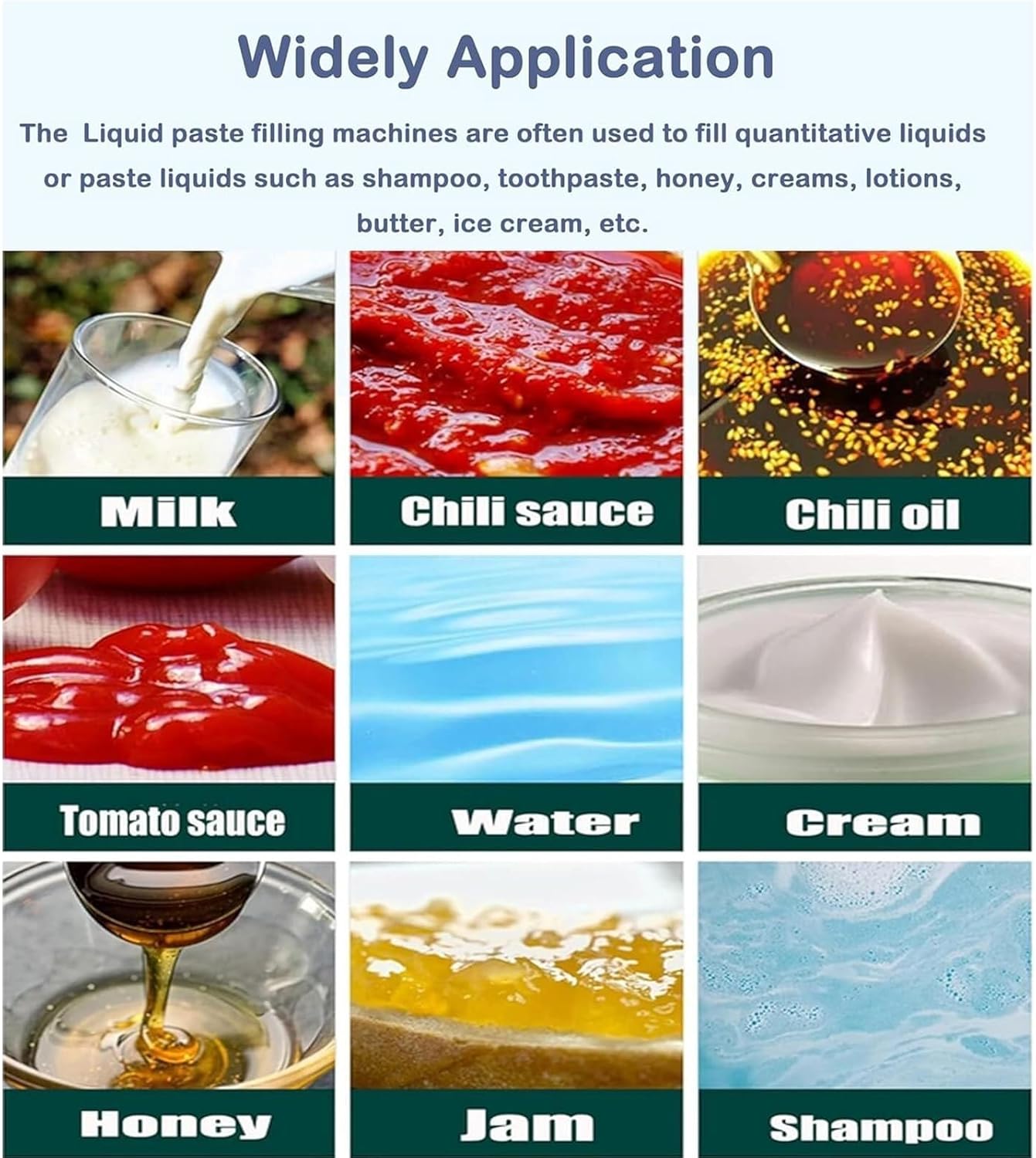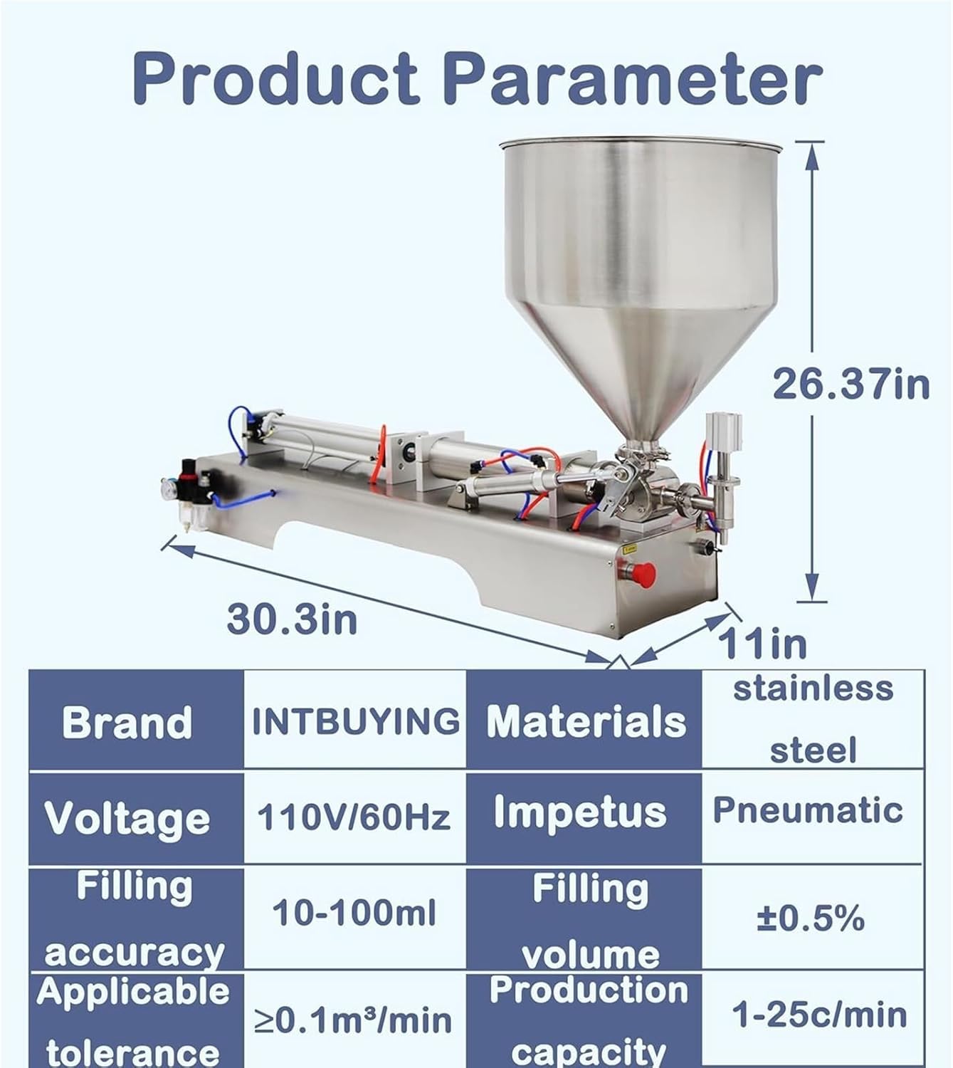 Scope of applicationVoltage: 110V/60HzMaterial: Stainless steel surfaceWorking principle: PneumaticFilling volume (ml): 10~100ml, 100~1000ml, 3~30ml, 30~300ml, 5~50ml, 50~500mlFilling accuracy (FS): ±0.5%Production capacity (cycle/minute): 1-25Applicable tolerance (m3/min): 0.1Applicable pressure (Mpa): 0.4-0.9Use power and gas sources that meet the requirements of this machine. Under continuous working conditions, the stability of the gas source must be maintainedBefore disassembling, cleaning or repairing the machine, be sure to turn off the gas source and power supplyThe electrical control components are installed in the rear half of the machine (near the control button) and the lower part of the frame. Do not rinse the machine body directly with water under any circumstances, otherwise there is a risk of electric shock and damage to the electrical control components.After turning off the power switch, the machine electrical control circuit still has voltage. When repairing the control circuit, be sure to unplug the power cord.Before filling the material, it is best to clean the machine with a detergent and then rinse it with clean water to prevent oil or foreign matter from mixing into the material, causing material waste and machine damage.