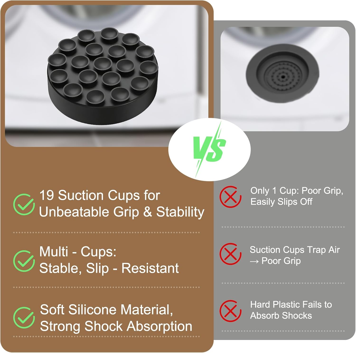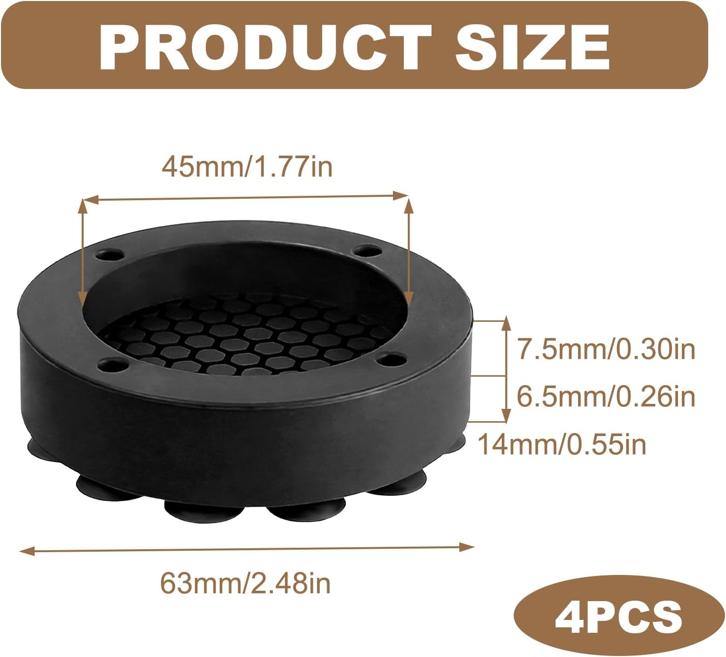 Bring more tranquility and stability to your home with this versatile set of 4 anti-vibration pads. These handy brackets are designed to reduce vibration, reduce noise and protect your appliances and floors. Effective cushioning by honeycomb structure The special honeycomb structure of these anti-vibration mats allows you to absorb and distribute the shocks generated during the spin cycles of your washing machine. This can help reduce noise and reduce mechanical stress on the device itself as well as on the ground below. Strong grip thanks to 19 suction cups. The bottom of each pad has 19 suction cups. These provide a strong and reliable grip on smooth surfaces such as tiles, vinyl or varnished wood, making this product an effective non-slip accessory. Your washing machine or dryer stays securely in place, even during the most vibrant cycles. Made of soft and easy-care silicone. Made of quality silicone, these shock absorbers are flexible, durable and easy to clean. The material is waterproof and retains its elasticity over time. Its moderate hardness ensures that the pad stably supports the weight of the device without over-flattening. Quick and tool-free installation Installation is extremely simple. No screwdrivers or glue required. Just slightly lift each corner of your appliance (for example, from the washing machine), slide one of the feet under the foot of the appliance and rest it. Repeat for all four corners – your devices are securely and stably installed. Compact dimensions for universal use Each anti-vibration pad measures 63mm in outer diameter, 45mm in inner diameter and 14mm in total height. These compact dimensions make them discreet, practical, clutter-free and suitable for most standard device stands. More than just a washing machine holder. This 4-piece set provides enough pads for your major devices. In addition to the washing machine, they are ideal for a tumble dryer to minimize vibration. They can also be placed under a refrigerator to dampen its slight vibrations and noises, or under unstable tables and furniture for stability and to protect the floor from scratches. Product details: Package included: 4 pieces anti-vibration pads Material: high quality silicone Dimensions: outer diameter 63mm, inner diameter 45mm, height 14mm Surface: Honeycomb structure for cushioning Bottom: 19 suction cups for non-slip grip. Colour: Black (discrete) Use: for washing machine, dryer, refrigerator, dishwasher, furniture, etc.