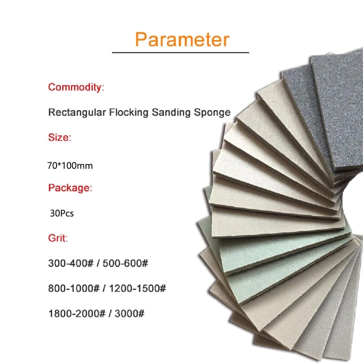 Abrasive BrushesProduct Specification: - Assorted Grits Model: 4 Different Grades of Superfine (P300-400/P500-600), Ultrafine (P800/1000), Microfine (P1200/1500, P1800/2000), X-Microfine (3000)- Sanding Sponge Sheet Size (LxWxH): 2.95 x 3.93x 0.2 inch (70x 100 mm)- Color: BluePackage Include:- 30x Sanding Sponge==========Origin : Mainland ChinaType : Sanding PaperSize : 70*100*5mm/2.75" x 3.93"x0.2''Shape : RectangularGrits : 300-3000 Grits