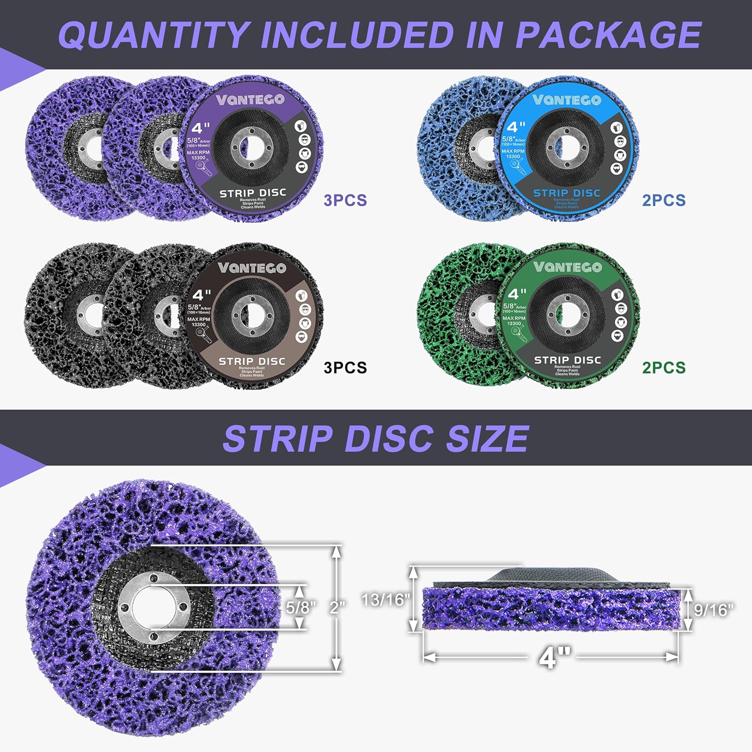 Vantego 10-Pack 4" x 5/8" Paint Stripping Discs for Angle Grinder Rust Remover Metal Stripping Quick Removal Grinding Wheel Replacement (Purple ×3, Black ×3, Blue ×2, Green ×2)