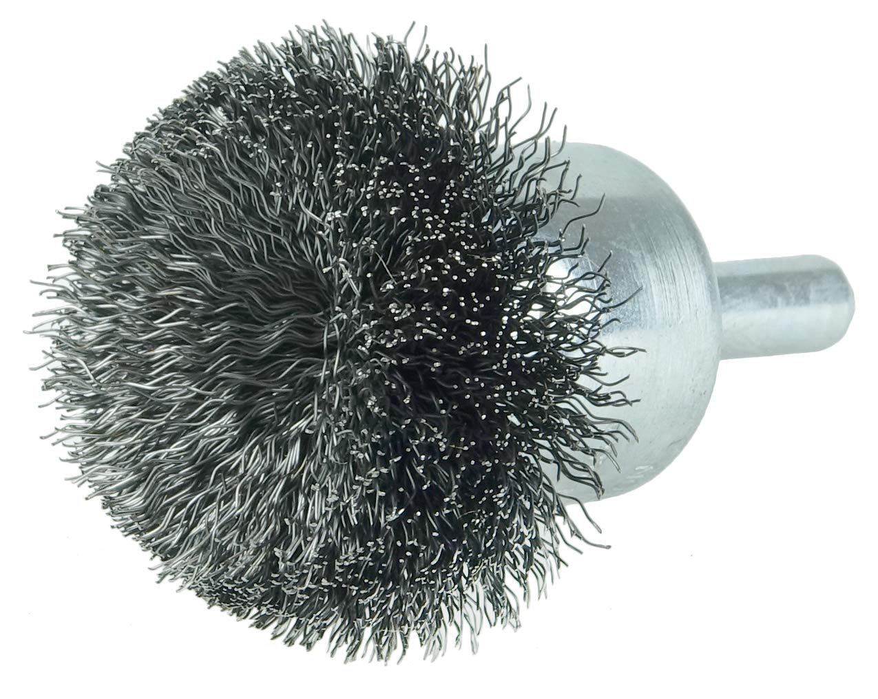 Weiler End Brush, Circular Flared Stem Mount, 1-1/2 in Diameter Brush, 1/4 in Shank Diameter, Crimped Filament/Wire Type, 0.006 in Filament/Wire Diameter, Steel Fill, 7/8 in Trim Length, 20000 rpm Maximum. Weiler 1-1/2" Circular Flared Crimped Wire End Brush features crimped wire fill which has been "pre-flared" to match the working angle of the brush at operating speed and suited for addressing broad and slightly contoured surfaces. 1/4" stem diameter for use on die grinder and right angle die grinders. Wire end brushes are for use on high-speed portable power tools for addressing smaller surfaces and recessed areas. End brushes feature an integral 1/4" steel stem for safe operation at high speed and quick mounting into the collet or chuck of either electric or pneumatic die grinders. At Weiler, we passionately embrace change to improve our products and our processes to move the company and our customers forward. By bringing new ideas and creative problem solving together in an open, collaborative environment, we will improve our customers’ productivity and create profitable growth. Weiler Abrasives is eager to create a collaborative partnership to overcome your toughest cleaning, grinding, cutting, de-burring and finishing challenges. Weiler manufactures precision brushes, abrasives, and maintenance products. The company was founded in 1898 in Germany, is headquartered in Cresco, PA, and is International Organization for Standardization (ISO) 9001 certified.