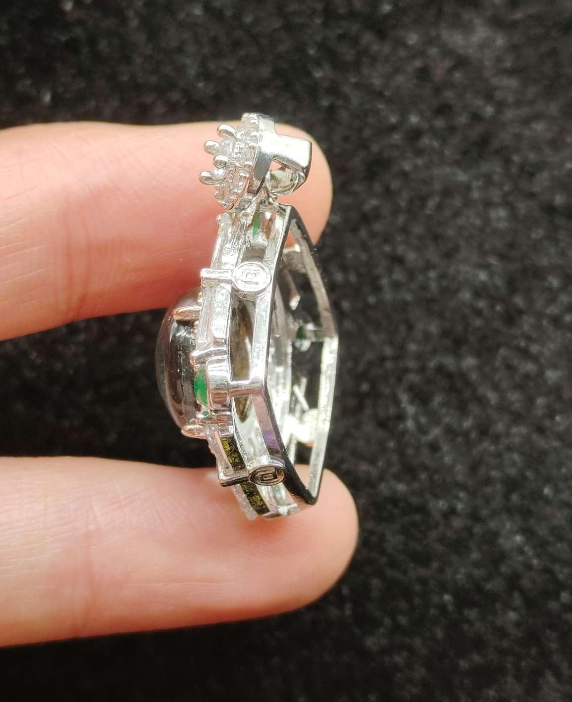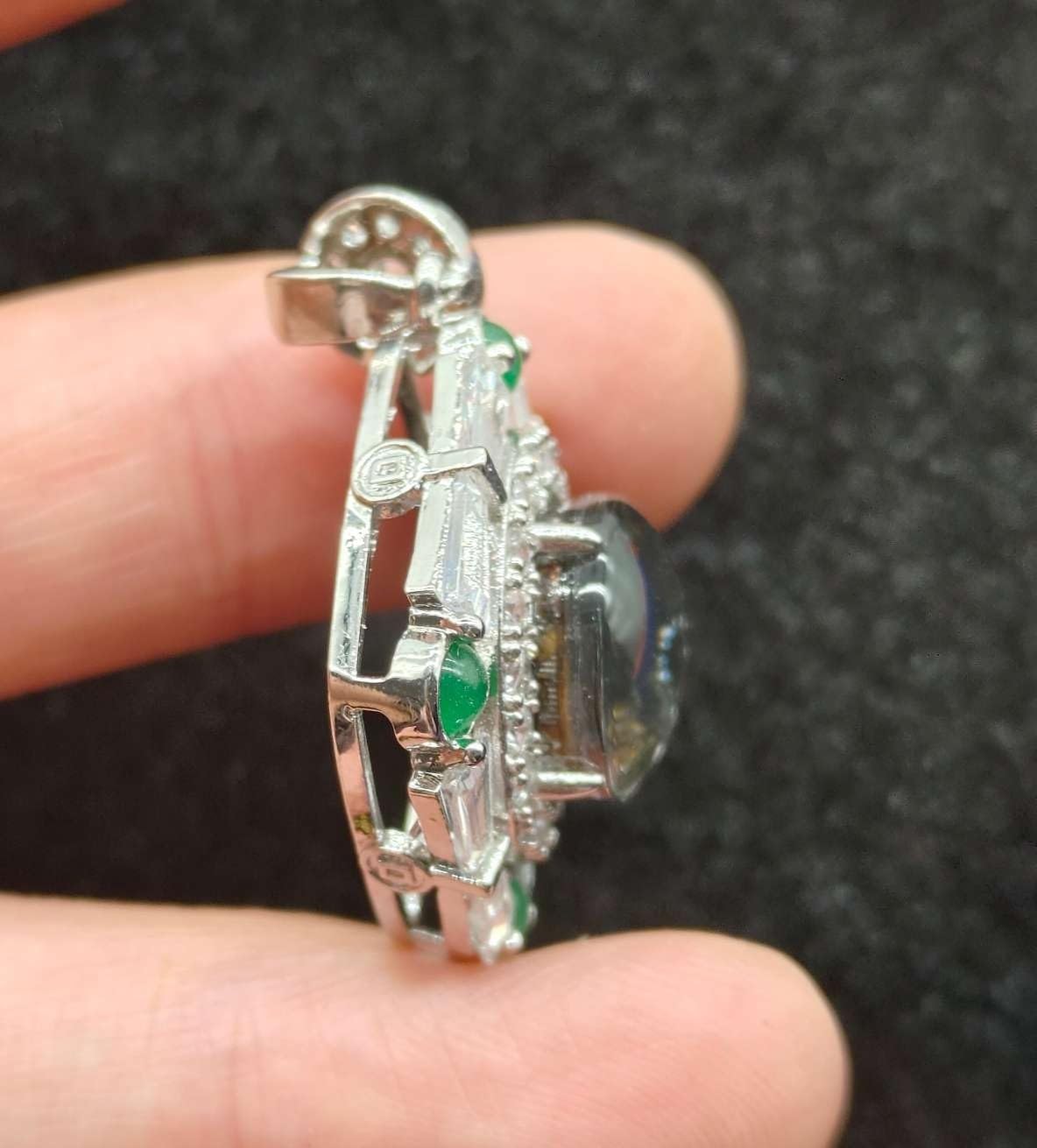 Discover the extraordinary with this genuine Kenya SERICHO pallasite meteorite pendant, measuring 35x27mm. This remarkable piece showcases the distinctive pattern of metallic matrix interwoven with translucent crystals, characteristic of pallasite meteorites. The pendant features an elegant Art Deco-inspired sterling silver setting adorned with sparkling clear stones and four vibrant green accent stones at the corners. The sophisticated geometric design frames the centerpiece meteorite specimen perfectly, creating a stunning contrast between the cosmic material and modern craftsmanship. Each pendant is unique due to the natural variation in meteorite patterns, making it a fascinating conversation piece and a treasure for both jewelry enthusiasts and space science collectors. The pendant combines scientific significance with artistic beauty, perfect for those who appreciate rare geological specimens or unique statement jewelry pieces.