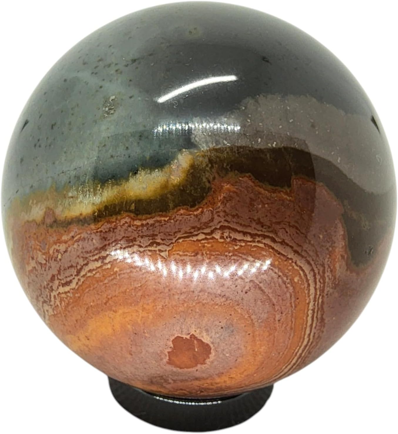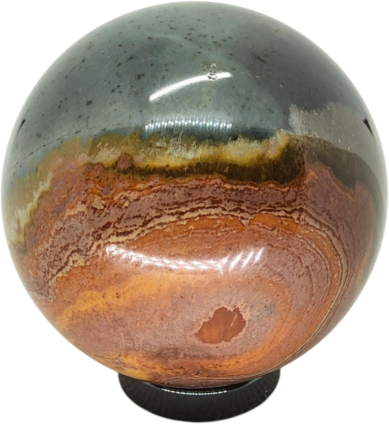 This listing is for a small Polychrome Jasper sphere display specimen, 100% natural. This is a completely polished specimen. A stand is included for display in your collection.The measurements provided are at the widest part and are close approximations. If you have any questions, please contact us. Thank You Tonya & Tim Daniels