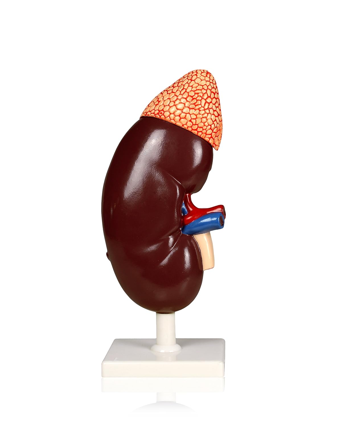 This model, 2X life size, shows the human kidney in frontal region. Internal structures are clearly revealed, including cortex, renal pelvis, calyxes, ureter, and origins of the renal artery and vein.
