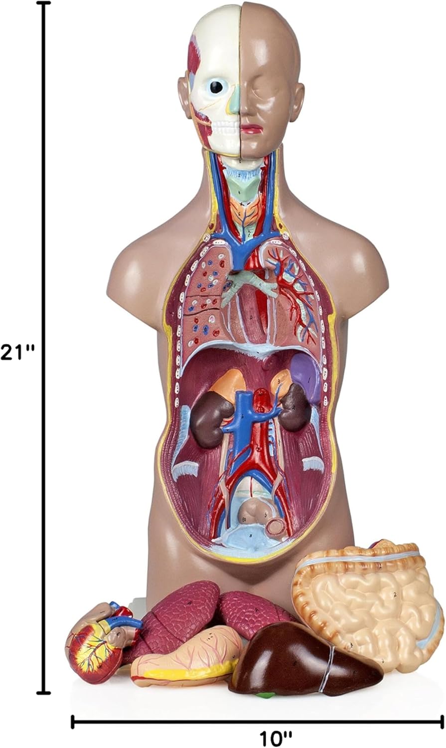 This 11 part, 50cm sexless human torso is appropriate for use in any classroom. This torso shows the major body systems and many anatomical features are numbered, which can be identified using the accompanying key card.11 removable parts:Torso½ of the brain2 part head2 lungs2 part heartStomachIntestinesLiverShipping info:21” x 10” x 6”5 lbs