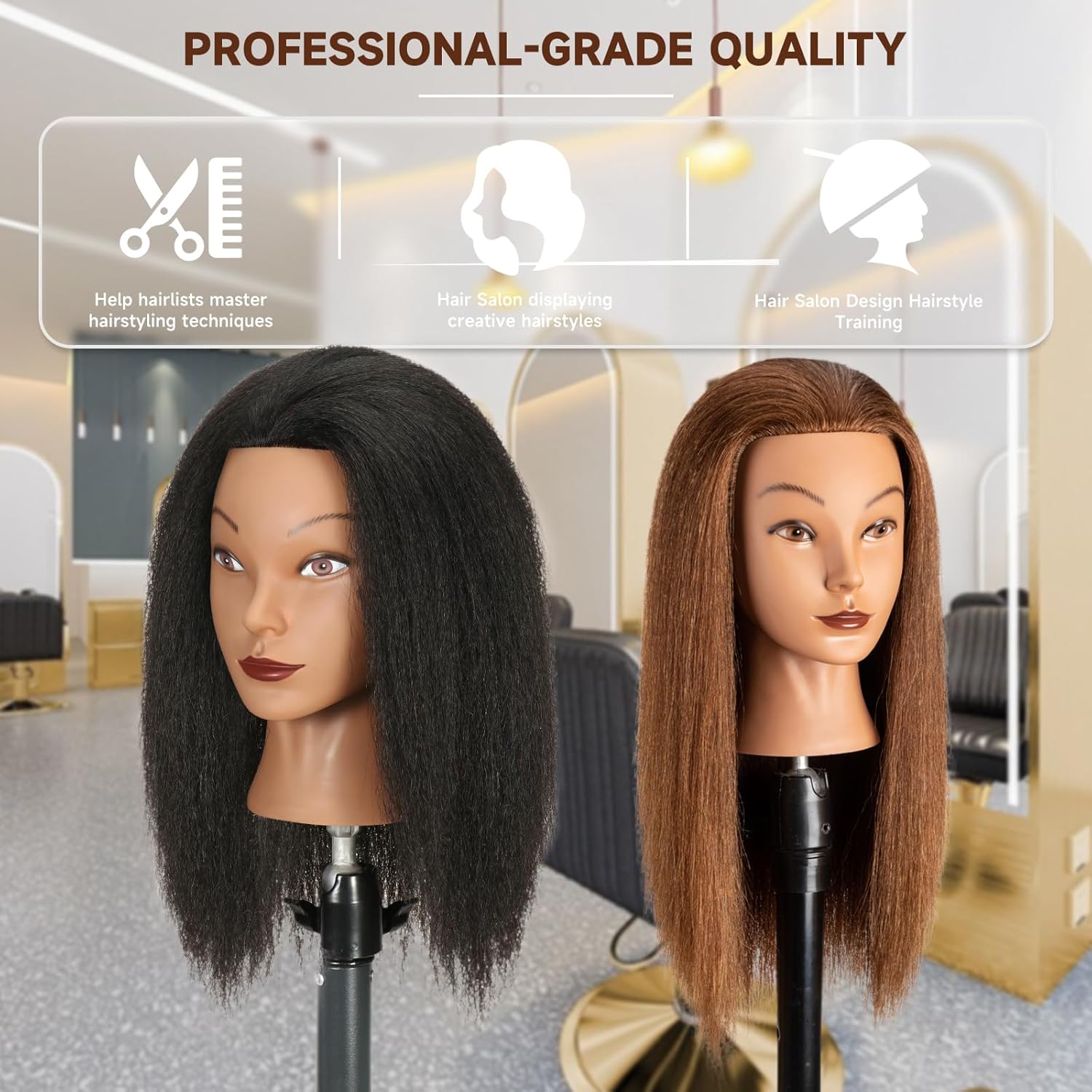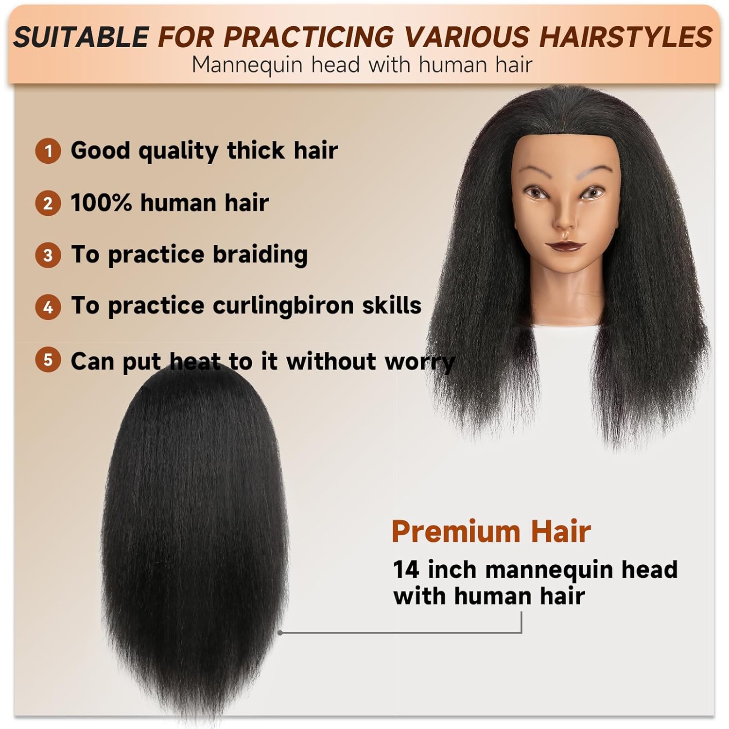 1.Professional-Grade Training Mannequin Head for Realistic Hairstyling Practice Elevate your hairstyling skills with our 14-inch human hair mannequin head, designed to meet the demands of cosmetology students, salon professionals, and DIY enthusiasts. Crafted with 100% human hair securely rooted into a durable base, this styling training head offers unparalleled realism for mastering braids, curls, updos, and advanced techniques. The realistic skin tone mimics natural scalp tension, ensuring lifelike practice sessions that translate to real-client confidence. 2.Key Features for Superior Performance Tangle-Free & Reusable Design: Engineered with high-density human hair (120% hair volume), this braiding mannequin head resists shedding and tangling, even after repeated use. The 14-inch length allows versatile styling, from layered cuts to intricate box braids, while the weighted base ensures stability during intense practice. Perfect for hair training, wet/dry cutting, and heat styling up to 350°F. 3.Trusted by Professionals for Diverse Techniques Optimized for textured and curly hair practice, this mannequin head for cosmetology is a favorite among salons and educators. Its natural hairline and adjustable clamp provide a salon-like experience, ideal for practicing tight weaves, extensions, and protective styles. Whether you're refining braiding skills or teaching advanced courses, this tool delivers consistent results. 4.Complete Kit for All Skill Levels Includes a free training head stand and elastic bands for hands-free practice. The washable, reusable hair retains softness and shine, making it a cost-effective choice for hair styling training. Beginners gain confidence with foundational techniques, while experts push boundaries with complex designs—all supported by professional-grade durability. 5.Why Choose Our Mannequin Head? Designed for black hair care mastery, this tangle-free hair training head addresses the unique needs of textured hair training. Its professional-grade materials and ergonomic design ensure long-term use without frizz or damage. It’s the ultimate investment for aspiring stylists and seasoned professionals alike.