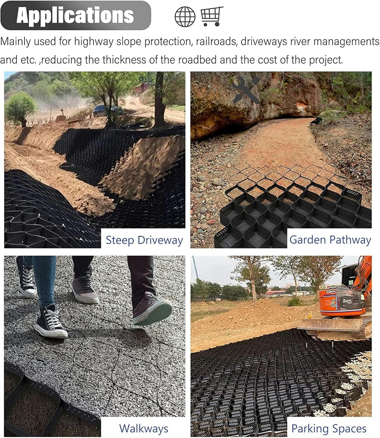Heavy Duty Ground Grid Paver (Driveway or Garden Pathway)Made from polyethylene HDPE material which lasts the test of time, and will hold any type of aggregate or filling you desire to fill it with. It is ideal for use in the construction of slopes and embankments prone to eroding, as well as driveways, roads, parking lots, playgrounds, trails and much more.Specification: 1. Material: HDPE (polyethylene)2. Size: Customizable3. Cropping? Can be Cut4. Height: 5cm (2inches)5. Weight Capacity: 3600kg/ 8000 lbsFeatures:1. Ground Grid is able to withstand heavy loads and a high volume of foot traffic. 2. It effectively eliminates further collapsing.3. Suitable for areas where you experience poor or unstable soil.4. This ground stabilization grid with flexible, transport can be folded, construction can be stretched into a network.Package List: Quantity: 1 x Ground Support Grid