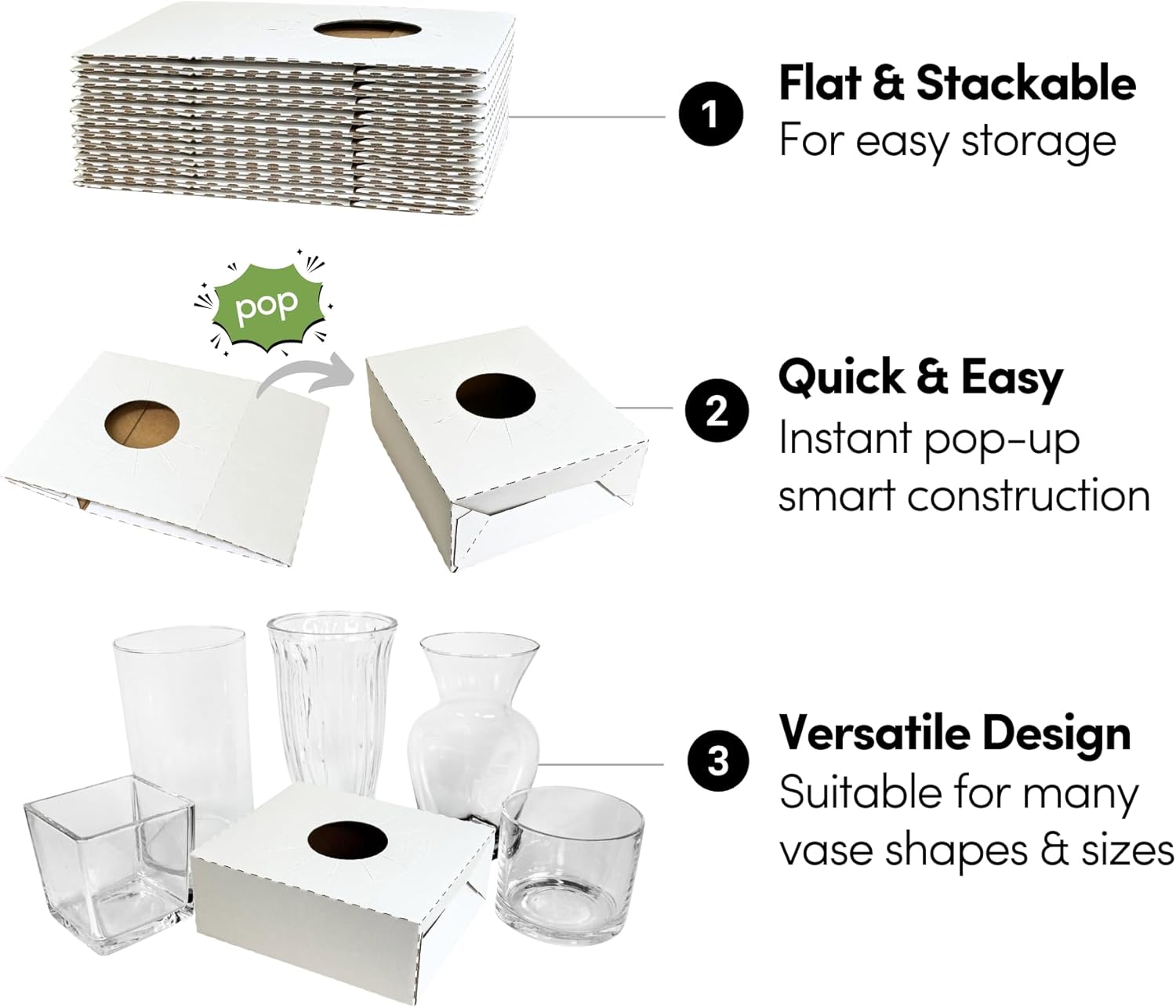 • Innovative Pop-Up Design: Ships flat and instantly pops into shape; no stapling, taping, or tabbing required. Saves valuable time for florists during busy prep and event days.