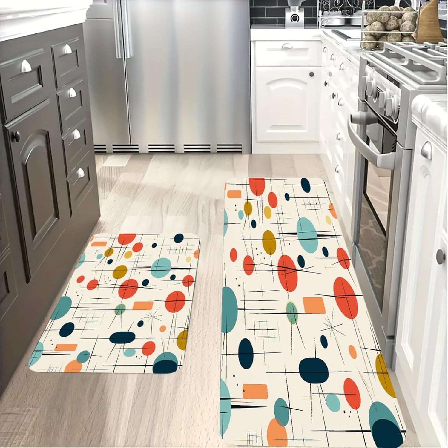 Elevate your standing experience with our 2-piece Cushioned Anti Fatigue Mat set, designed to blend comfort, functionality, and style across every room in your home. As a Comfort Desk Mat, it also eases the pressure of long workdays, making it a must-have for remote workers and home chefs alike.The Cushioned Anti-Fatigue Non-Skid Rug core offers targeted support that reduces strain on your feet, knees, and lower back—perfect for anyone who spends hours standing. Unlike thin, flimsy alternatives, this Modern Mid Century Kitchen Rug uses pill-resistant flannel that stays soft, even with daily use. It works equally well as a Non Slip Comfort Standing Mat in the laundry room, turning tedious folding and sorting tasks into a more comfortable routine.With its warm, inviting aesthetic, this Farmhouse Anti Fatigue Mat fits seamlessly into rustic, farmhouse, or modern home decor. Use the Cushioned Kitchen Rug as a soft landing spot by your bathroom shower, or bring it outdoors to create a comfortable standing area for gardening or grilling. Every detail is crafted to fit your busy lifestyle, from the easy-clean fabric to the versatile sizing that adapts to any space.