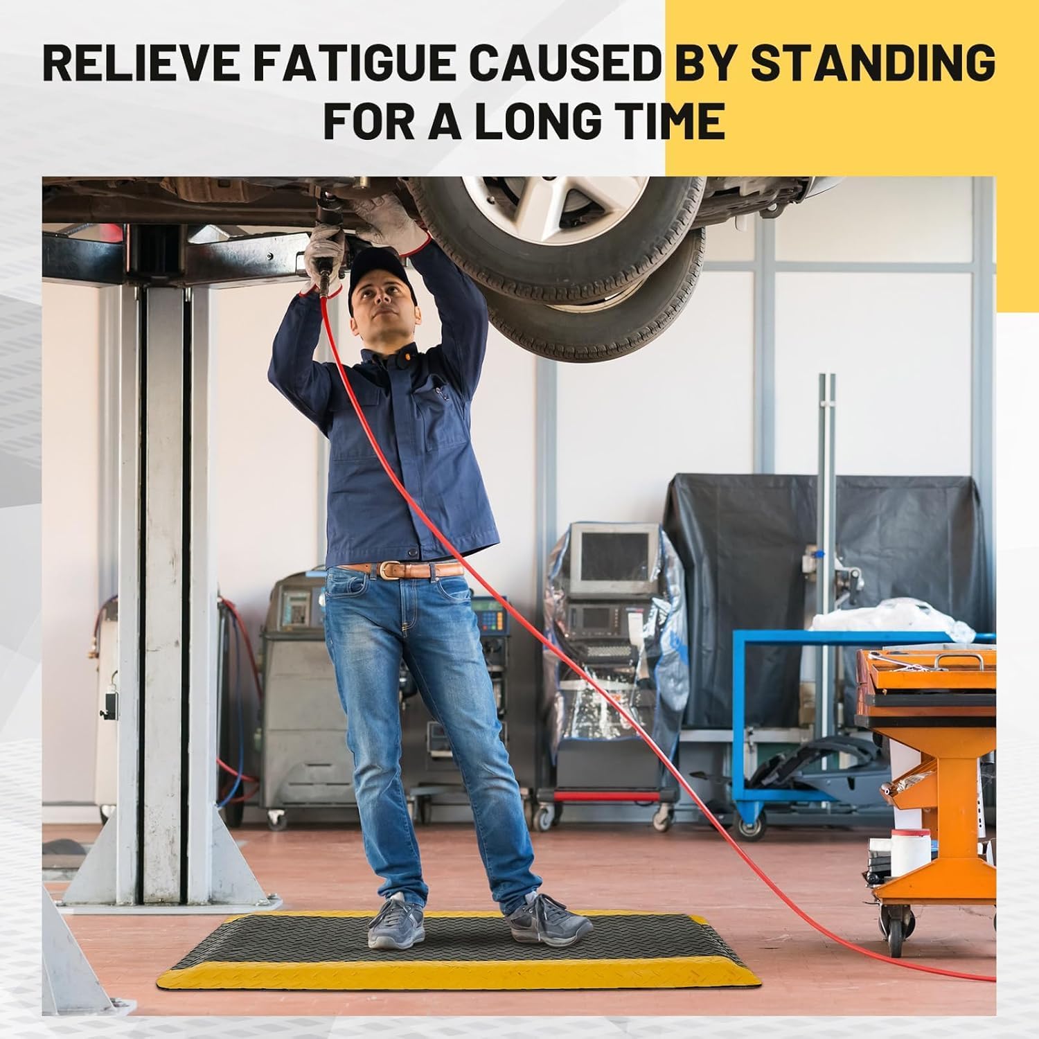 This Anti-Fatigue & Anti-Static Floor Mat provides dual protection for long-standing work environments. The ESD-safe surface prevents static buildup, while the ergonomic cushioning reduces foot and leg fatigue. Made from durable, high-density foam, it withstands heavy daily use in electronics assembly lines, workshops, and industrial settings. The non-slip base ensures stability, and the easy-to-clean surface resists oil and stains. Measures 36"x24"x0.6"—ideal for standing desks, production lines, or lab workstations (non-medical).