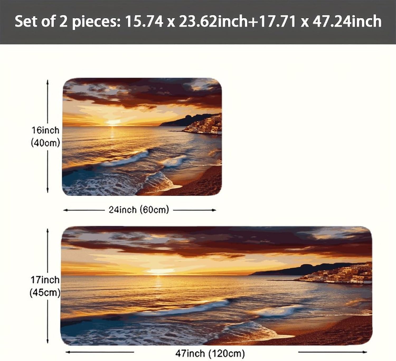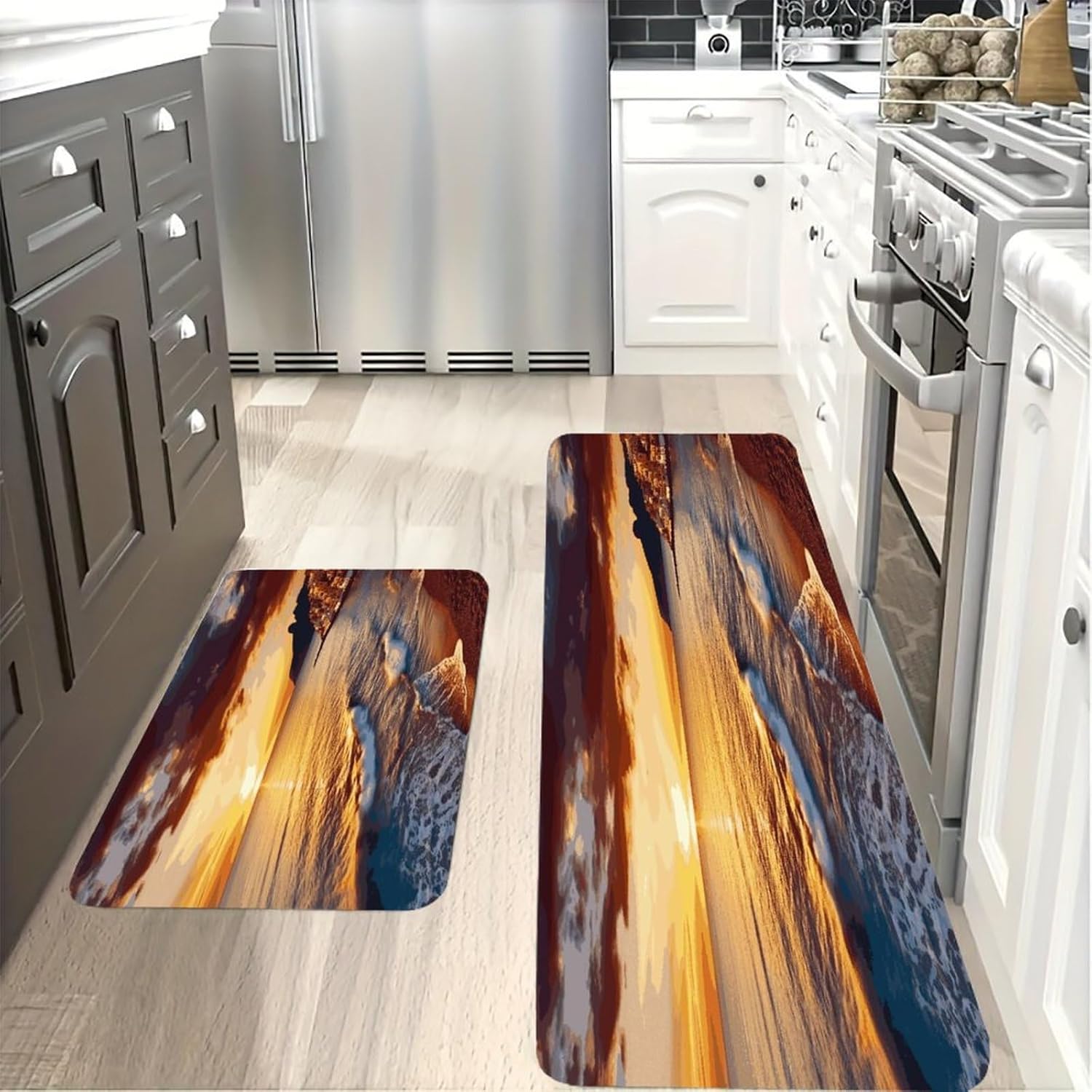 Step into instant comfort with our 2-piece Cushioned Anti Fatigue Mat set, designed to transform every standing moment into a relaxing experience. As a Comfort Desk Mat, it also eases the strain of long workdays, making it a versatile addition to any home.The Cushioned Anti-Fatigue Non-Skid Rug core offers plush support that hugs your feet, reducing the tension that comes with standing for hours. Unlike thin, flimsy alternatives, this Seaside Sunset Kitchen Rug is made with pill-resistant flannel that stays soft and neat through repeated use. It doubles as a Non Slip Comfort Standing Mat in your laundry room, taking the stress out of folding clothes or loading the dryer.Perfect for modern and rustic spaces alike, this Farmhouse Anti Fatigue Mat combines style with practicality. Use the Cushioned Kitchen Rug in your bathroom for a soft step out of the shower, or bring it outdoors for a comfortable spot to garden. Every detail is crafted to fit your busy lifestyle, from the easy-to-clean fabric to the multi-room functionality that makes this set a household staple.