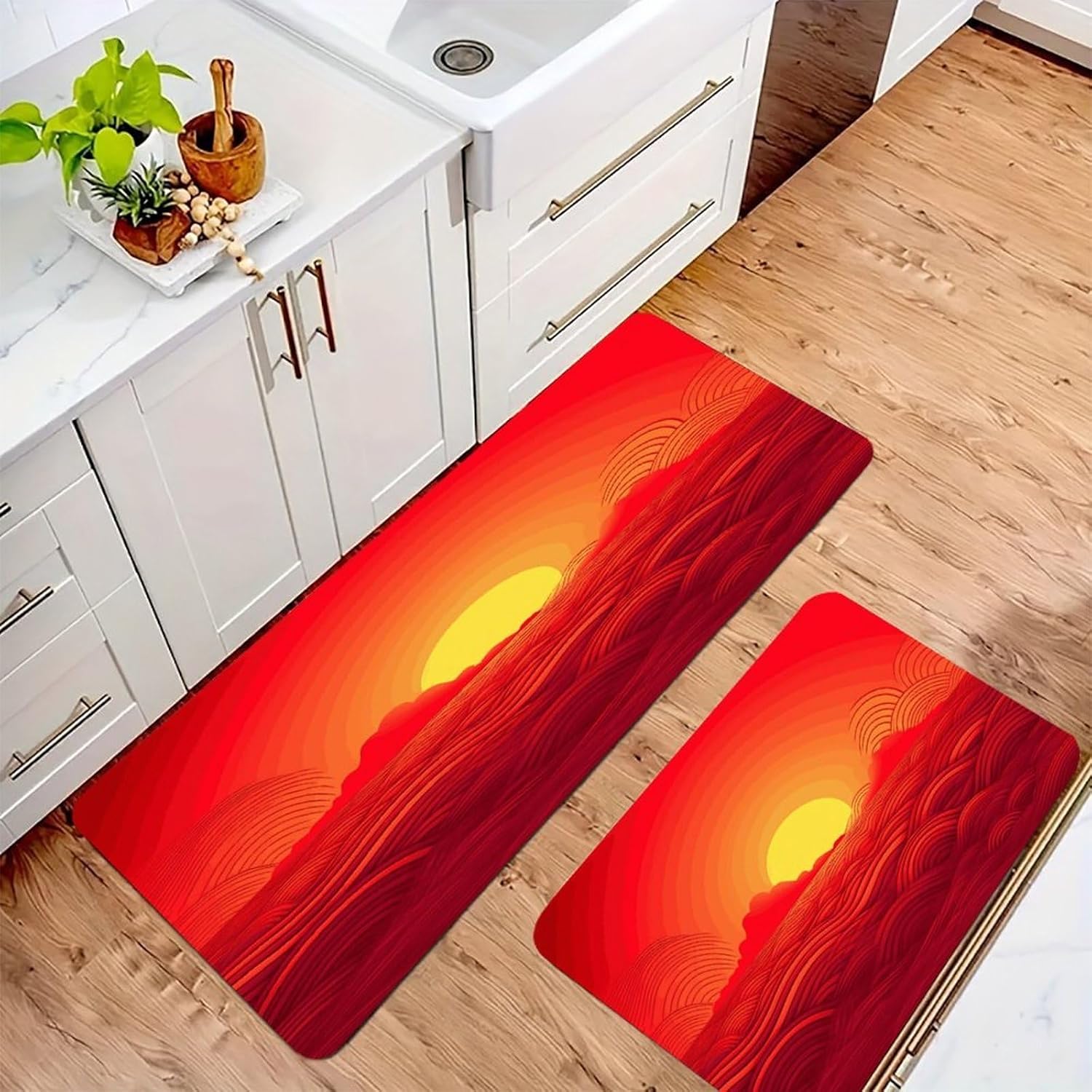 Step into instant comfort with our 2-piece Cushioned Anti Fatigue Mat set, designed to transform every standing moment into a relaxing experience. As a Comfort Desk Mat, it also eases the strain of long workdays, making it a versatile addition to any home.The Cushioned Anti-Fatigue Non-Skid Rug core offers plush support that hugs your feet, reducing the tension that comes with standing for hours. Unlike thin, flimsy alternatives, this Red Sunrise Kitchen Rug is made with pill-resistant flannel that stays soft and neat through repeated use. It doubles as a Non Slip Comfort Standing Mat in your laundry room, taking the stress out of folding clothes or loading the dryer.Perfect for modern and rustic spaces alike, this Farmhouse Anti Fatigue Mat combines style with practicality. Use the Cushioned Kitchen Rug in your bathroom for a soft step out of the shower, or bring it outdoors for a comfortable spot to garden. Every detail is crafted to fit your busy lifestyle, from the easy-to-clean fabric to the multi-room functionality that makes this set a household staple.