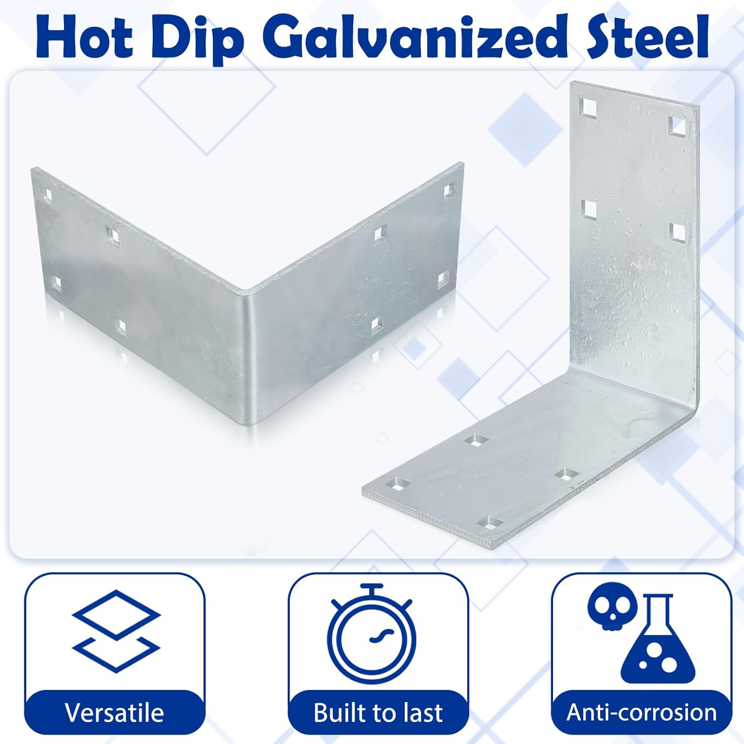 Features: Features include a hole for 9/16" and versatility to be compatible with a 1/2" carriage bolt. The dock hardware also boasts welded brackets to enhance its strength. These characteristics make it flexible and adaptable for a range of purposes, from fixing furniture to connecting timber. The silver color not only adds a sleek and classic touch to the galvanized outside corner, but also provides an extra layer of protection from harsh environmental conditions. Specifications: Material: galvanized steel Color: silverSize: approx. 10.25 x 10.25 x 5 inches/ 26 x 26 x 12.7 cmPackage includes: 2 x Galvanized outside corners Warm notes: Please note the size detail information before ordering. Manual measurement, please allow slight errors on size. The color may exist a slight difference due to different screen displays.