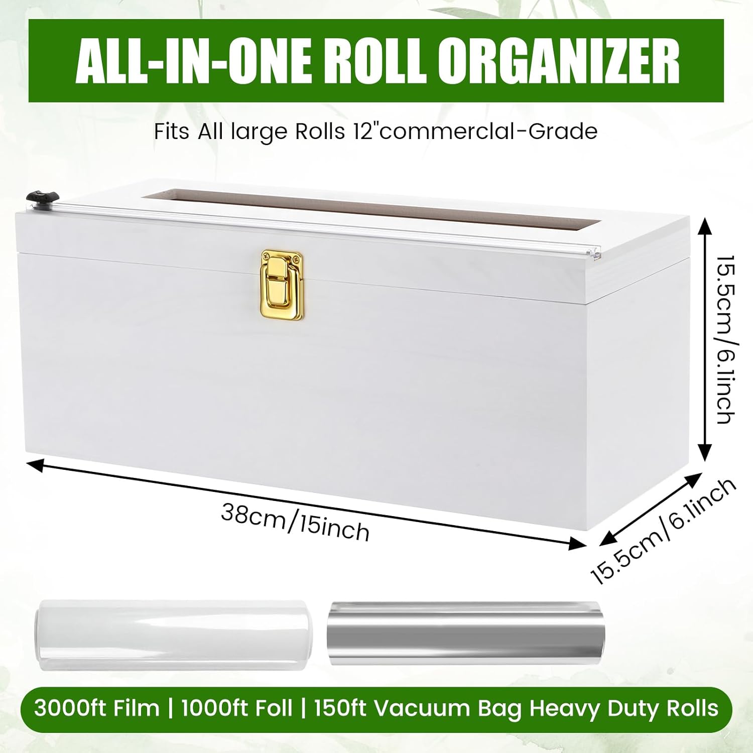 Features: No Assembly & Non-Slip Design: This plastic wrap dispenser requires no assembly—simply open and load your roll with no tools or complicated setup needed. It has rubber feet to prevent sliding on countertops and comes with sticker labels for easy organization, suitable for busy environments. Widely Used for Commercial & Home Spaces: This dispenser is ideal for restaurants, commercial kitchens and foodservice settings that need frequent use of plastic wrap and foil. It also suits home kitchens, providing an organized solution for food storage. Its stylish design enhances any space while meeting practical needs. Specifications: Material: bamboo (body), stainless steel (cutter), rubber (non-slip feet) Color: white Size: width: 12 inches Bamboo thickness: 2/5 inch (0.4 inch) Package includes: 1 X 12 inch plastic wrap dispenser 4 x Non-slip rubber feet 16 x Reusable organization labels Notes: Manual measurement, please allow slight errors on size. The color may exist a slight difference due to different screen displays
