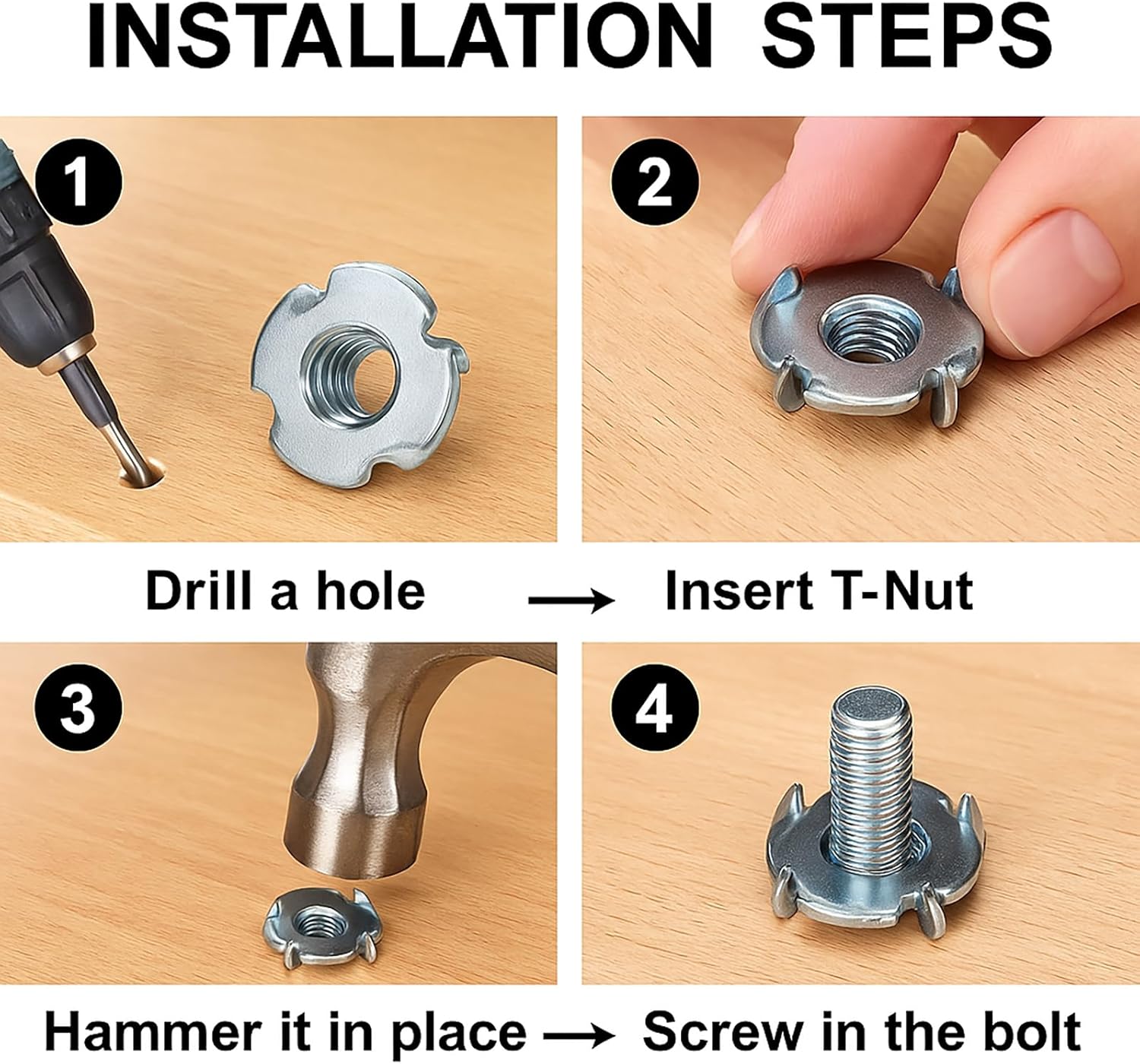 Unmatched Stability: The 4-prong design digs into the wood, creating an anti-rotation anchor that won't budge, even under significant torque. Superior Durability: Zinc-plated steel construction not only provides immense strength but also protects against rust and corrosion, ensuring your work stands the test of time. Clean, Professional Finish: Once installed, the T-Nut flange sits flush with the surface, creating a clean and professional look for your finished piece. Endless Possibilities: From custom furniture to home gym equipment, these versatile T-Nuts are the secret to strong, demountable joints. Product Specifications: Product Name: 4-Prong T-Nuts / Tee Nuts Material: High-Quality Carbon Steel Finish: Zinc Plated (Corrosion Resistant) Thread Size: 1/4"-20 TPI (Coarse) Barrel Length: 5/16 Inch