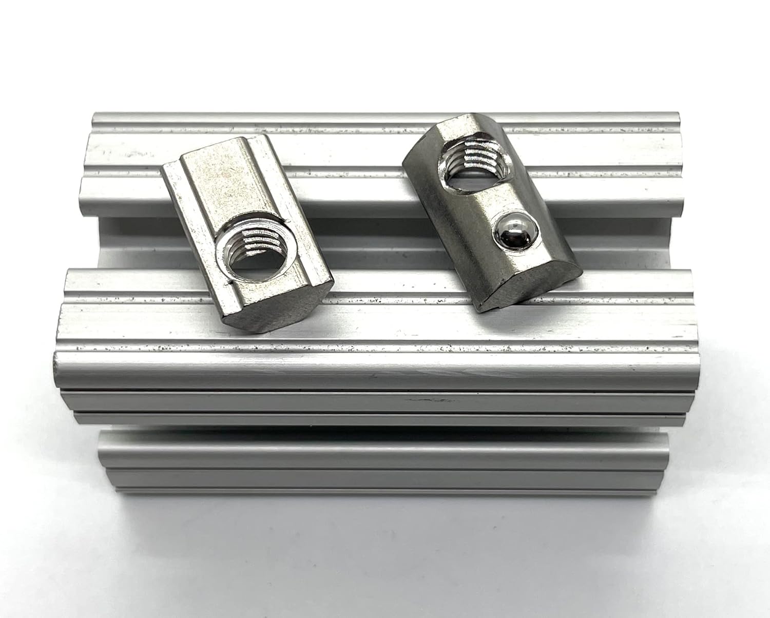Commonly used with aluminum extrusion profiles. Roll-In t-nuts allows installation on a closed end. Install t-nuts anywhere on the t-slot of an extrusion profile. No machining required when using a t-nut and a bolt to mount corner brackets, joining plates, and anchor fasteners. Ball spring positions the T-nut in the slot.