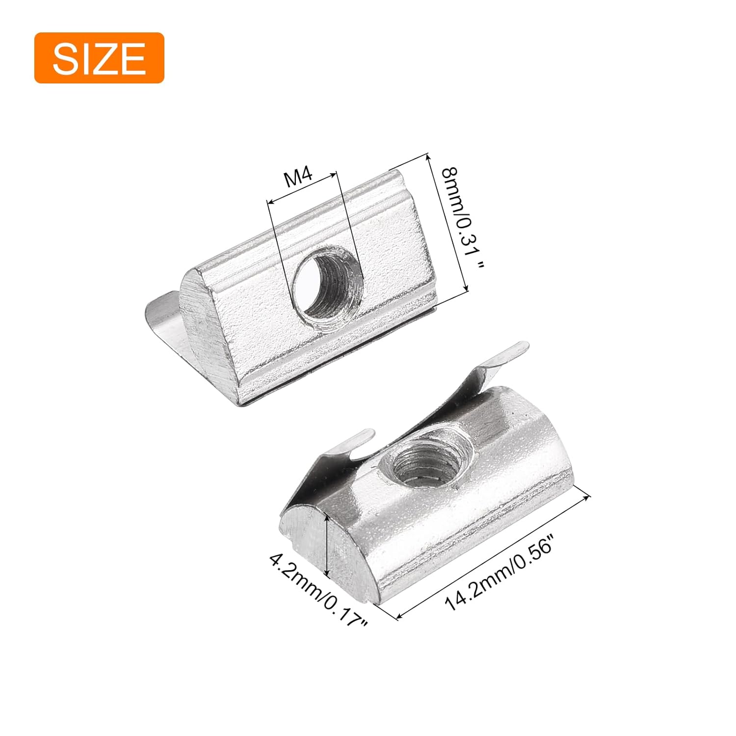 Description: Material: T-grooves made of high-quality carbon steel. These nuts have high hardness and long service life. Surface is nickel-coated for good rust resistance and better performance. Wide application: T-grooves with spring, versatile in various applications including CNC milling 3D printers, CNC laser cutters, CNC plasma cutters, robot projects, 3D milling, protective housing and special workstations among many others. Easy installation: user-friendly design with spring plate, the nut rolls into the specific groove and turns with a screw, the nut securely fastens Note: These nuts are small in size, so they should be stored in a place inaccessible to children for their safety. Specification: Material: carbon steel. Surface: nickel-plated. Colour: silver tone. M4 size: 14.2 x 8 x 4.2 mm / 0.56 x 0.31 x 0.17 inches (L x W x H). Package includes: 20 x M4 T-slots with spring.