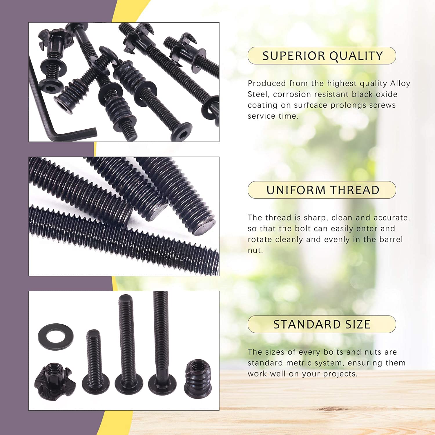 ๐ฏ Swpeet 123Pcs 4 Types M6 Carbon Steel Black Hex Drive Socket Cap Bolts and Threaded Inserts Nuts with T Nut 4 Pronged Tee Blind Nuts and Flat Washers Kit, 1Pcs Wrench Bolts Fully Threaded Hex Socket Screws ๐ข WHY CHOOSE US? ๐ฅ 1, Beautiful Color ๐ Black zinc, adopting zinc plated to prevent rusting. ๐ฅ 2, High Quality Material ๐ Made of high quality Carbon Steel Black, high hardness and perfect wear resistance, without burr, smooth, non-slip. Every barrel nut and bolt is Precision mechanical thread, made of high-quality carbon steel material. ๐ฅ 3, Including Bolts and Threaded Inserts Nuts with T Nut and Flat Washers ๐ With so many different types of screws, Including Hex Drive Socket Cap Bolts and Threaded Inserts Nuts with T Nut and Flat Washers. youโre sure to find the ones that are suited to the specific application you need them for. ๐ฅ 4, Wide Applications ๐ Suitable for pine, plywood, fiberboard, etc, have a good effect in the advanced furniture combination. Commonly used in home and office appliance and other projects. ๐ข Specifications: ๐ฅ Material: Carbon Steel Black ๐ฅ Drive type: M6 Hex socket ๐ฅ Head style: Round head ๐ฅ Color: Black ๐ข Package Included: ๐ฉ15Pcs ----------- M6x30mm ๐ฉ15Pcs ----------- M6x50mm ๐ฉ8Pcs ------------- M6x70mm ๐ฉ25Pcs ----------- M6x15mm Threaded Inserts ๐ฉ20Pcs ----------- M6x10mm T Nuts ๐ฉ38Pcs ----------- M6 Flat Washers ๐ฉ1Pcs ----------- Allen Wrench ๐ฉ1Pcs ----------- Storagre Box ๐ฉIntotal 123Pcs