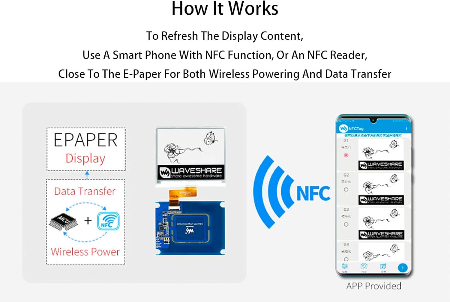 4.2inch Passive NFC-Powered e-Paper, with 400 x 300 resolution, Adopts novel passive NFC technologyNo battery required, no more battery life trouble. Users can transmit data from a smartphone or NFC reader to e-Paper and refresh it by NFC. Features 1) No backlight required, e-Paper keeps displaying the last content for a long time without power. 2) It does not contain a power supply such as the battery itself, which is suitable for application environments with a limited power supply. 3) You can modify the display content by smartphone. 4) Equipped with ABS plastic shell with good strength and toughness. 5) Provide a supporting Android APP/IOS APP to help users edit and manage the display content of the ink screen. 6) Refreshing Example: Refreshed By Smartphone, Comes With Android APP, As Easy As Swiping A Credit Card. 7) Online User guide is Provided: //bit.ly/47lawZe Specification Power: NFC-powered Resolution: 400 x 300 Dot pitch: 0.212 x 0.212 Refresh time: 4s Display color: black, white Viewing angle: >170° Outline dimension: 105.0mm x 94.1mm x 9.90mm Display dimension: 84.8mm x 63.6mm Package Content 4.2inch NFC-Powered e-Paper x1 Double-sided foam tape x2