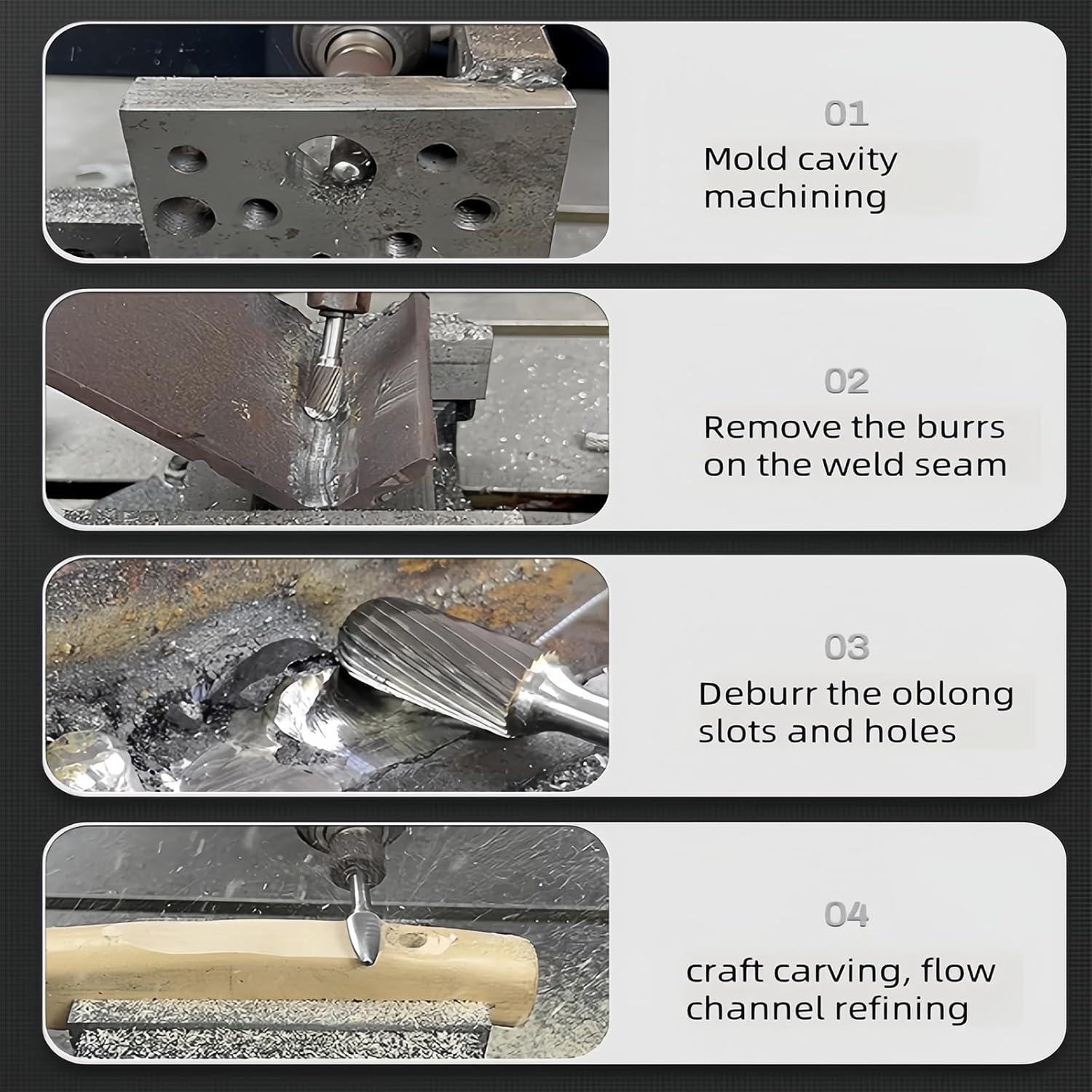 1. Premium Material: Crafted from tungsten steel, offering exceptional micro-hardness and abrasion resistance for long-lasting durability. 2. Superior Toughness: Engineered to withstand high-impact tasks without chipping or breaking, ideal for demanding industrial use. 3. Versatile Design: Compatible with most rotary tools, ensuring seamless integration into your workflow. 4. Applications:Perfect for precision tasks across industries, including: Machinery, aviation, automotive, shipbuilding,and artistic engraving. 5. Efficiency: Reduces downtime with extended lifespan and consistent performance. 6. Precision: Sharp cutting edges enable clean, accurate finishes in intricate projects. 7.1 Double groove: The two blade grinding head is suitable for softer materials such as copper, aluminum, iron stone, wood, plastic, etc. The two blade polishing head has fast chip removal and is not easy to block the patterns during polishing and carving 7.2 Single groove: The single blade grinding head is suitable for harder materials such as iron and steel. The pattern of a single groove determines that using softer objects is not ideal because during the cutting process of a single groove knife, waste easily blocks the groove, causing the depth of the groove texture to change and the cutting ability to decrease 8. The recommended speed is 6000-50000r/min, and the processing effect is poor when it is below 10000r/min 9. When using, clamp the cutting tool firmly and use reverse milling as the cutting method to avoid reciprocating cutting