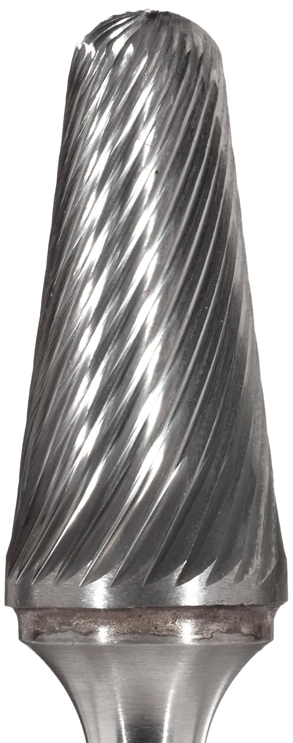 BM pointed cone shape bur. Finish bright. Material solid carbide. Diameter 0.375 inch.Overall length 2.5 inch.Shank size 0.25 inch.
