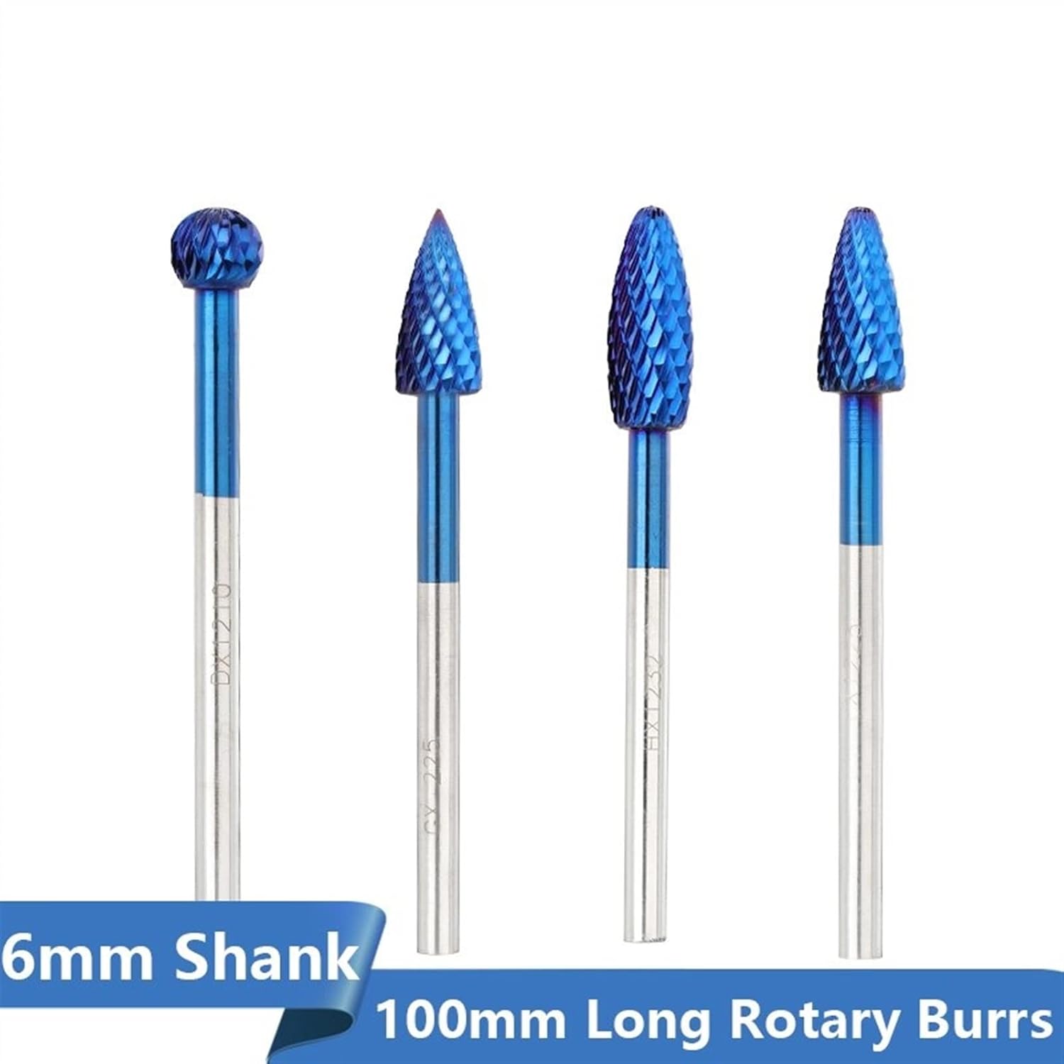 Combination Drill & Taps6mm Shank Rotary File Blue Coated Tungsten Carbide Rotary Burrs Bit Metal File 100mm Long File For Metal 1PcsApplication:The carbide alloy rotary file use is extremely widespread, appies in the mold processing manufacture. Machine parts bevel edge, inverted round and trench processing, The clean-up casting,forging, weldment's edge, Burr and welded joint; pipeline, impeller passage's light entire processing, metal and nonnmtallic material (bone jade stone) industrial art carving. Can be processed cast iron, cast steel, carbon steel, alloy steel, stainless steel, copper, aluminum and other metals, and marble, jade, bone and other non-metallic.Specification:Type: Metal File Material: CarbideCoating: Blue Coated Flute: Double Cut Shank: 6mm Largest Diameter: 12mmCutting Length: 10mm 25mm 32mm Overall Length: 100mmType: D F G HNote:Due to the difference between different monitors, the picture may not reflect the actual color of the item.Package Including: 1pc/4pcs Metal File