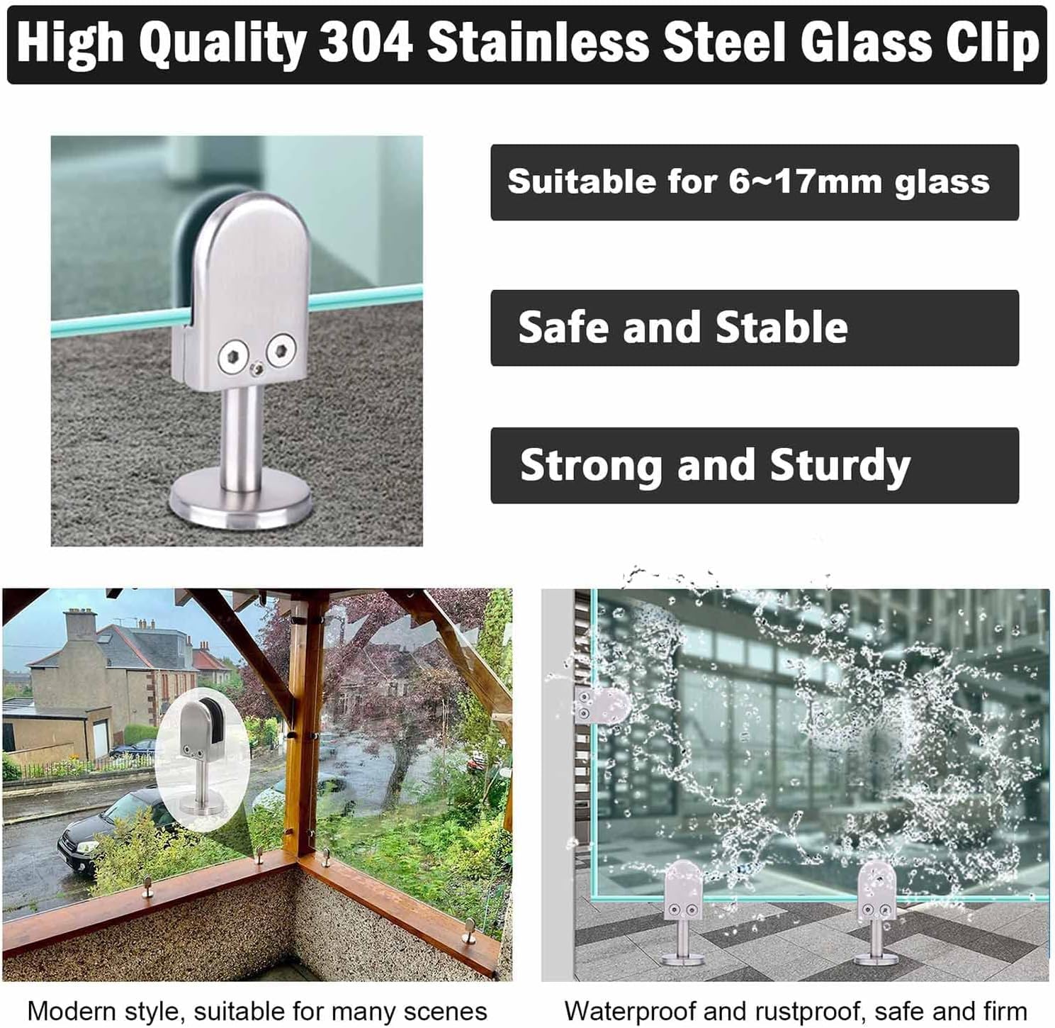 APPLICATION SAFETY: Our glass clips can be fixed on the glass stably and safely, not easy to be damaged, beautiful and wear-resistant. Durable and practical, long service life. The glass holder kit has a simple structure, easy to install and remove. Suitable for glass fixing of display racks guardrails stair railings and so on.Features1 Guardrail clip Made of high quality material, not easy to aging, smooth and beautiful surface.2 The glass clips are equipped with glass gaskets, which will not scratch the glass.3 These glass clips are perfect for fixing balustrade stair railings bathroom pool glass brackets home garden balcony handrail railings fence terrace handrail brackets and floor brackets ideal for indoor and outdoor useProduct Name: glass holder/glass clamp/glass clip/glass shelf clip/glass floor clipMaterial: 304 stainless steel