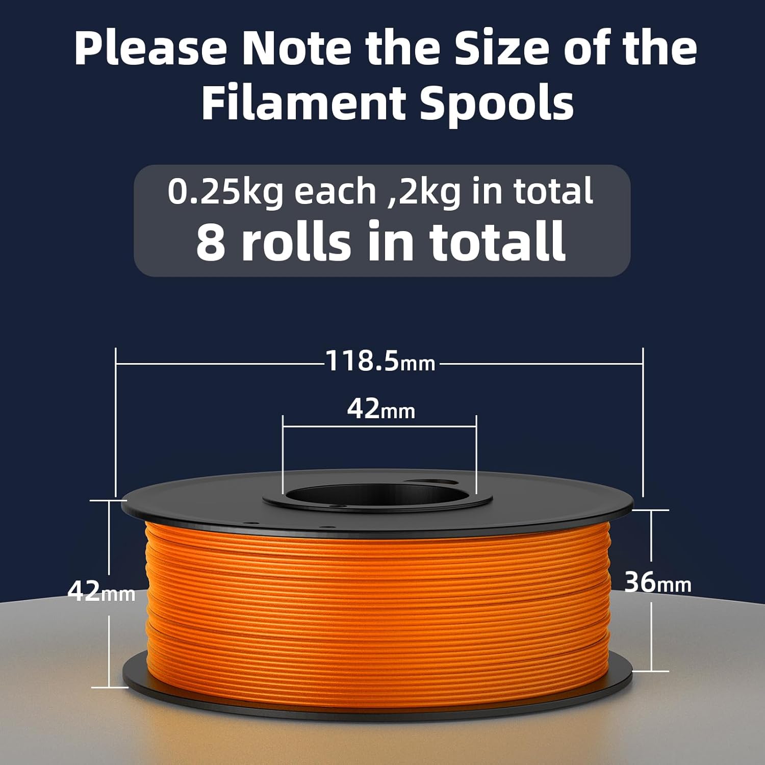 PLA Filament 1.75mm, 250g Spool, 8 Rolls, 2kg in Total Black/White/Red/Yellow/Pink/Blue/Orange/Green