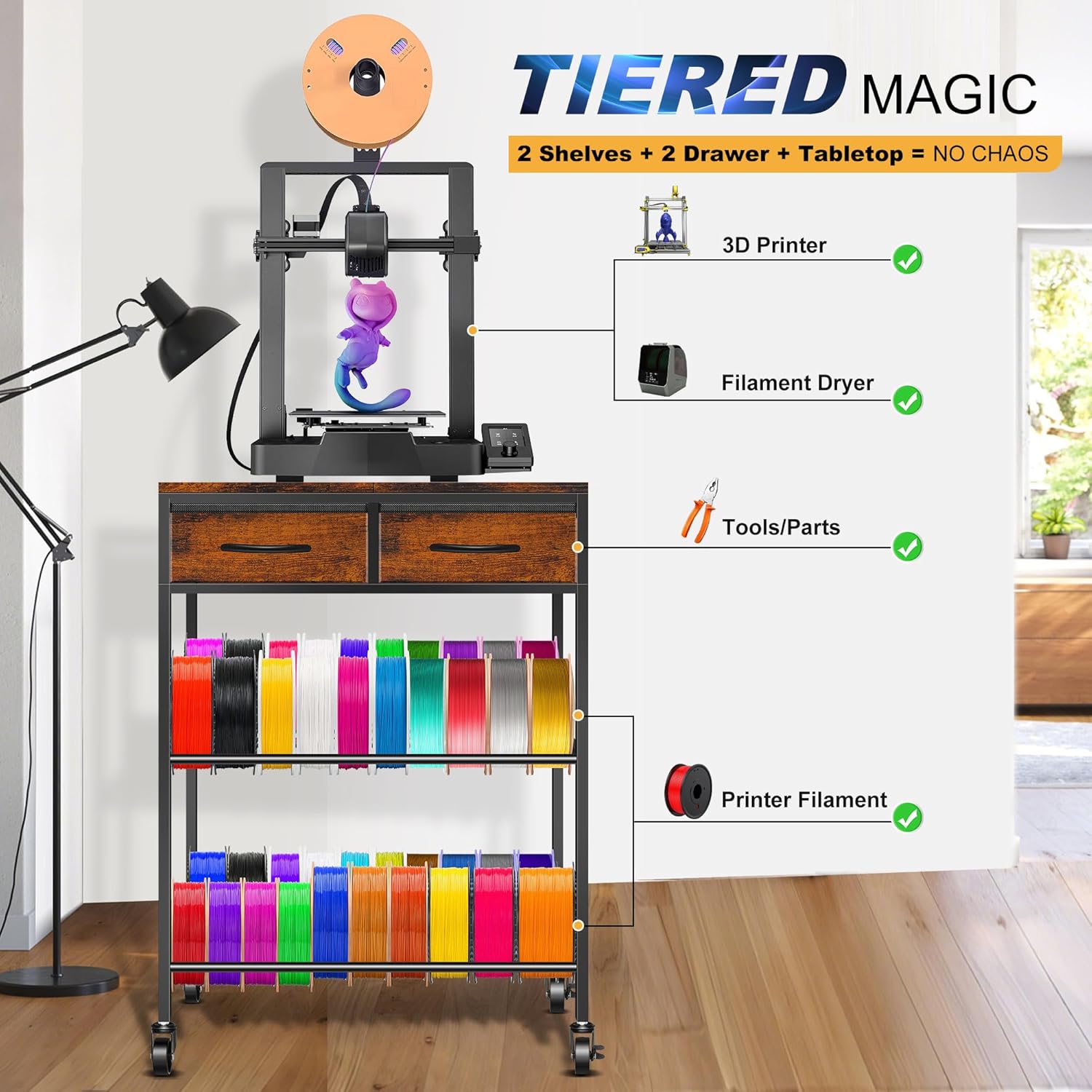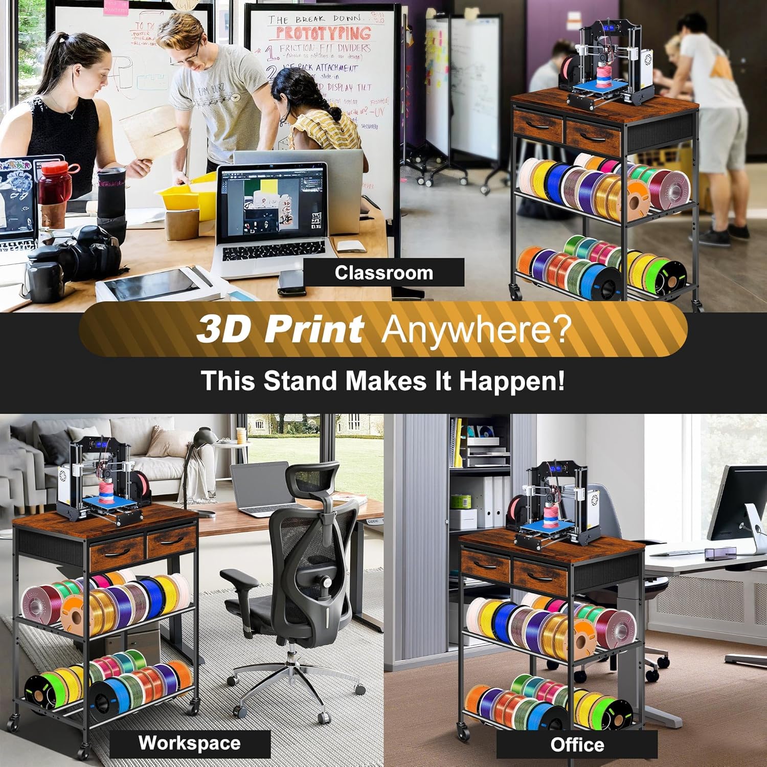 Tired of wobbly prints or cluttered 3D gear? Meet the 3D Printer Table with 2-Tier Filaments Storage—your workflow game-changer.Built for precision: 12mm-thick wooden top + reinforced metal frame eliminates wobble. No more failed projects—just consistent results.Storage that works: Two deep drawers + 2-tier shelves fit 200g–1kg filaments, tools, and parts. Tidy up in seconds, spend more time creating.Tiered efficiency: Tabletop (printer) + upper shelf (dryer) + lower shelf (tools) + drawers maximize vertical space—grab what you need instantly.Versatile & flexible: Fits classrooms, offices, workshops—turn any corner into a pro station. Choose 360° rolling wheels or fixed feet; works with all filament sizes.Backed by unbeatable support: 30-day hassle-free returns, 24/7 customer service, and a 3-year warranty—print with confidence.Picture a stable, organized workspace where creativity flows. No clutter, no wobble, no limits. This isn’t just a table—it’s your 3D printing sidekick. Invest today and print smarter.
