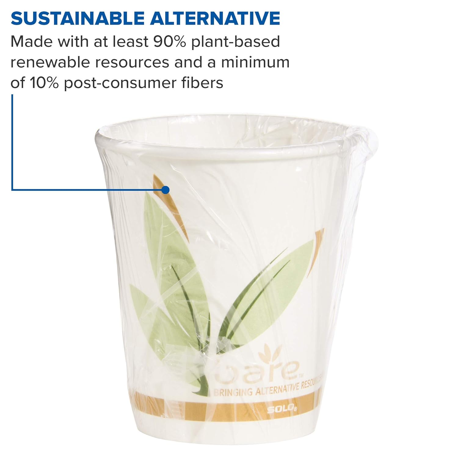 The SOLO W370RC Bare disposable cup has a 10 oz. capacity and is made of processed chlorine free (PCF) paper, wrapped in plastic for sanitation, and suitable for use with hot beverages. The PCF paper in this cup contains at least 10% recycled post-consumer fiber. The cup's printed Bare design coordinates with other SOLO Bare line products (sold separately). It comes in a case of 480 cups.SOLO manufactures disposable plastic, paper, foam, and post-consumer recycled content cups, plates, and other products for food and beverage service. The company, founded in 1936, is headquartered in Lake Forest, IL.