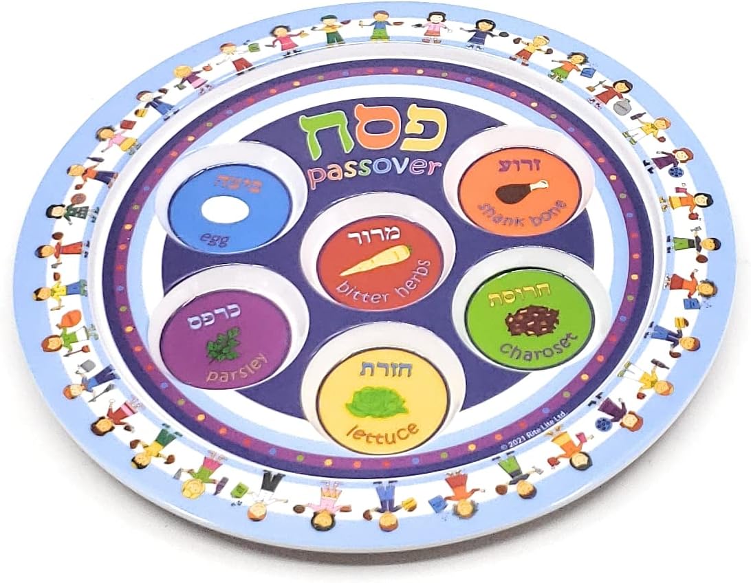 This is a set of items for celebrating the Passover Holiday, geared towards a young child or a family with young children. A small 9" Seder plate made of unbreakable melamine and a matching 3-section matzah cover with Afikomen bag - these are all decorated in bright colors, showing children of the many Jewish communities around the world. Added to that is a child's Haggadah and a kid-size Kiddush cup. Any child will enjoy having a set of their own to keep them engaged at the Passover Seder. This set makes a great gift for a young one.