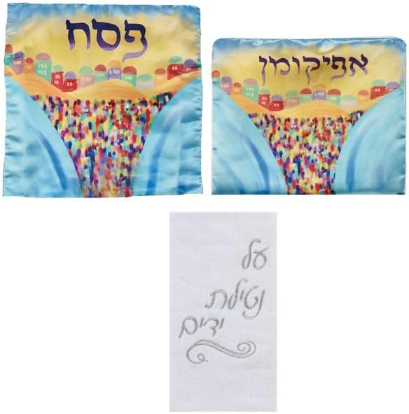 The colorful cloth cover that holds the 3 pieces of Matzah that are used in the Seder ceremony has a matching bag for holding and hiding the "Dessert" Afikoman piece of Matza. We've added an embroidered towel for the ritual hand washing that we do Twice on Seder night. Pick your favorite colors and patterns.