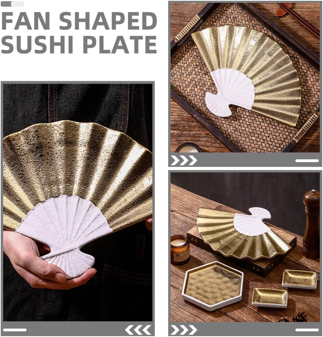 Package List 1 x Sushi Plate Features -Refined aesthetics: the sophisticated design elevates the dining experience, making it for both casual and formal meals shusi tray -Material:Ceramic -Multipurpose: suitable for a variety of dishes including salads, sushi, sashimi, and more, making it a versatile piece of tableware seafood plate -Distinctive shape: the fan shaped design of this sushi plate stands out, adding a touch of elegance and uniqueness to your dining setup plate for dumpling -Color:Golden -Product Info:Ceramic Sushi Plate -Size:32.00X21.50X2.00cm/12.58X8.45X0.79in - and easy maintenance: crafted from ceramic, this plate is built to last and easy to clean, ensuring it remains in excellent condition chip dipping plate -Ideal for various venues: for home dining, restaurants, and hotels, offering a stylish and functional option for different dining settings snack dishesGoods Descriptionsushi boat dish Elevate your dining presentation with the ceramic electroplated fan-shaped sushi plate.sushi trays This versatile plate is for serving a variety of dishes, from sushi and sashimi to salads and appetizers.dip snack tray Its stylish design and ceramic material make it a standout piece in any restaurant or hotel dining room