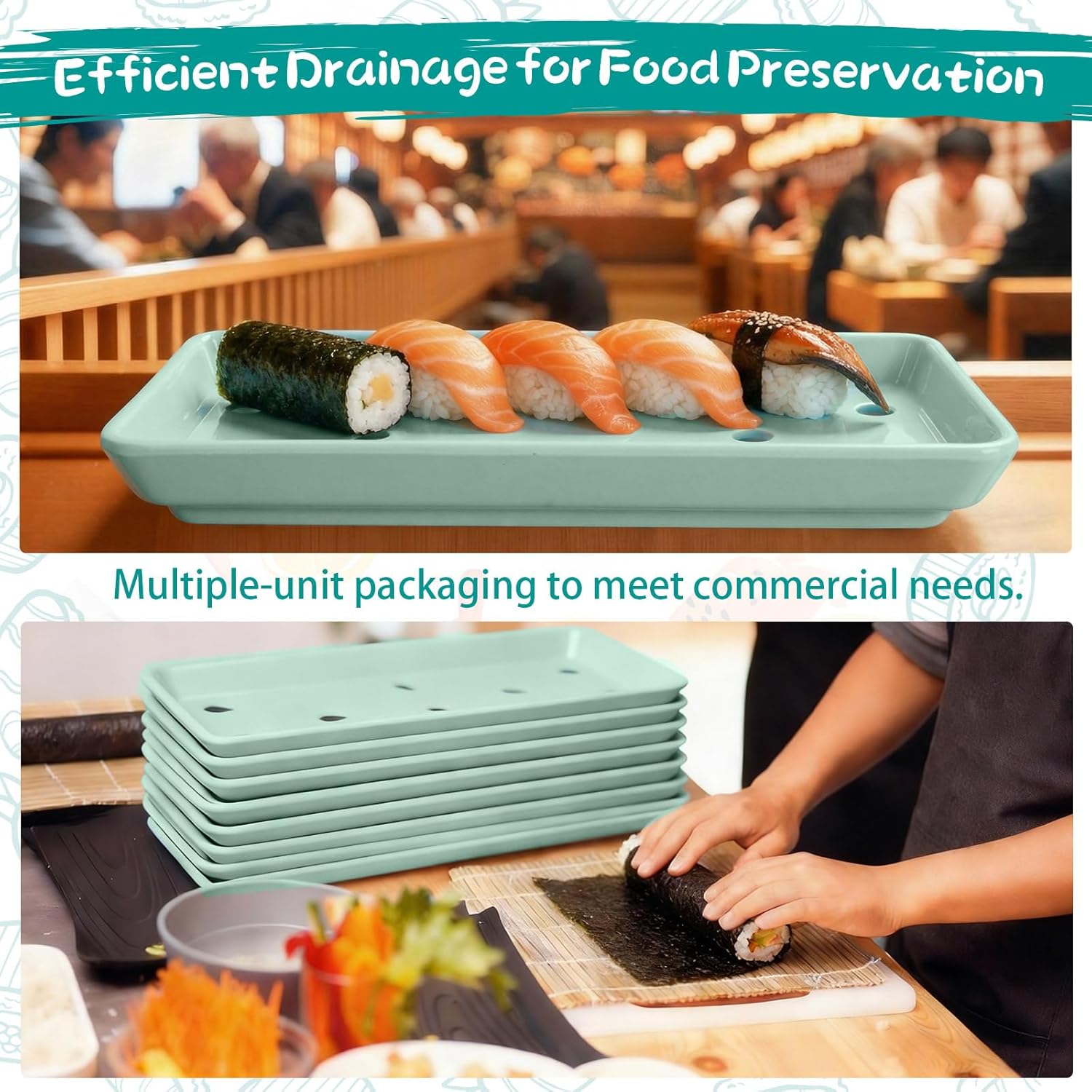 Features: While designed for sushi and sashimi, these plates can also be used for appetizers, desserts, or other culinary presentations. Their size and material make them a versatile addition to professional and home kitchens. These plates are designed for both presentation and practical storage needs. The drip holes and material composition make them appropriate for refrigeration use while keeping food neatly organized. Specifications: Material: Melamine Color: green Size: Each length, width and height: 8 X 3.75 x 1 inches/ 20.3 x 9.5 x 2.5 cm Each weight: 6.3 ounce/ 180 g Package includes: 12 X sushi plates Notes: Manual measurement, please allow slight errors on size. The color may exist a slight difference due to different screen displays