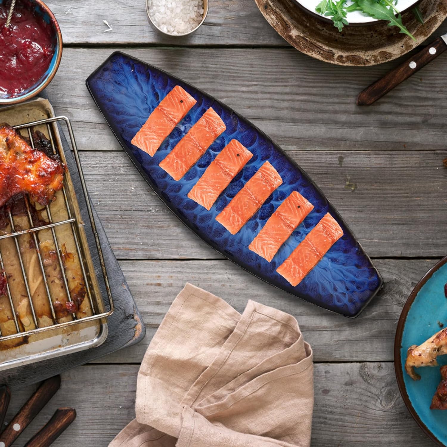Package Include 1 x ceramic dish Characteristics - Size: About 36.50X13.00X4.50cm/14.34X5.11X1.77inch. - Material: Ceramic. -Product Info:Ceramic fish plate - Color: Dark Blue. - The size meets your different needs, the shape of the ship is more convenient to handle. - High-temperature firing creates a better vitrified glaze, emitting a fascinating gloss, and stains are not easy to adhere to the surface, and it is easier to clean sushi display platter. - Anti-slip design-one circle is no at the bottom japanese sushi plate. - A nice choice for your friends or families who like to eat sashimi japanese sushi plates. - Dark blue imitation fish scale glazed surface, the shape design is more unique porcelain platter.Goods Informationjapanese sushi plate It is one of the for you.seafood platter Do you like to eat sashimi? Are you in search of a multi-purpose, beautiful sashimi plate that ? If your answer is yes, you should come and take at this product! Our practical ceramic plate will meet your needs