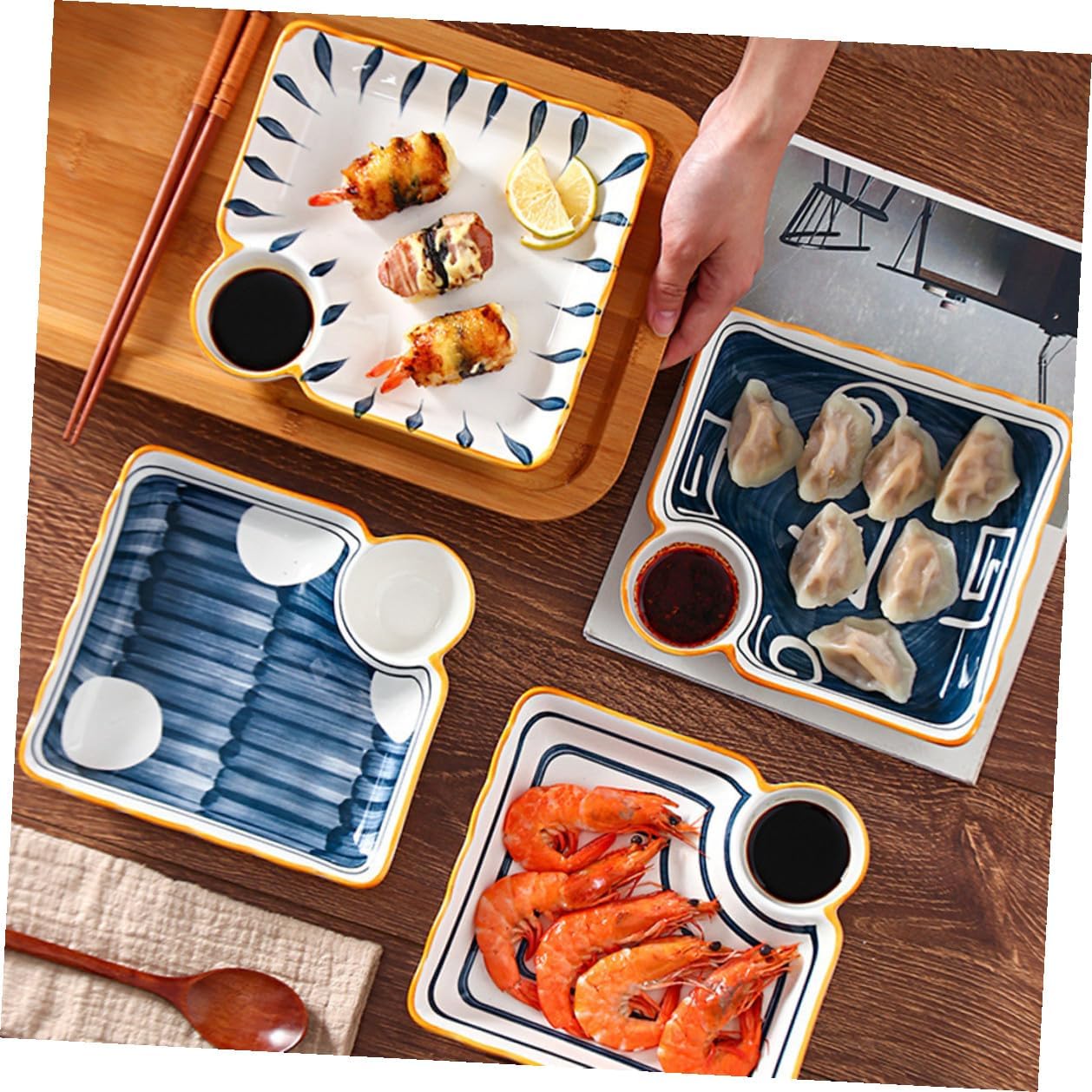 Package List 4 x Plates Characteristics -Product Info:Sushi dessert plate - Material: Ceramics. - Color: Assorted Color. - Size: 18.50X17.50X3.50cm/7.27X6.88X1.38in. - The bottom of the plate adopts a unique design, placed on the table is not easy to slid, very safe sushi dipping tray plate. - It can be used as a Western food plate wonderfully, which can increase your appetite well sauce dipping plate. - This dish is not only suitable for hotel use, but also suitable for home use, compact appearance, is a beautiful home furnishings sashimi serving platter. - This creative multi-grid plate is very suitable to be used for three meals or snacks sushi dipping plates. - Made of great quality material, it's and safe for use.Goods Descriptionsquare container strong and sturdy.sauce dipping plate The unique design and craftsmanship its popularity and practicality.sushi cermaic service tray This food plate is made of safe and ceramics, and beautiful, practical and .sushi display plate It is very convenient to use, and the two-zone design is very practical.sashimi serving platter The ceramic material has a texture.mini sushi dishes The design is simple, and the surface is smooth without burrs