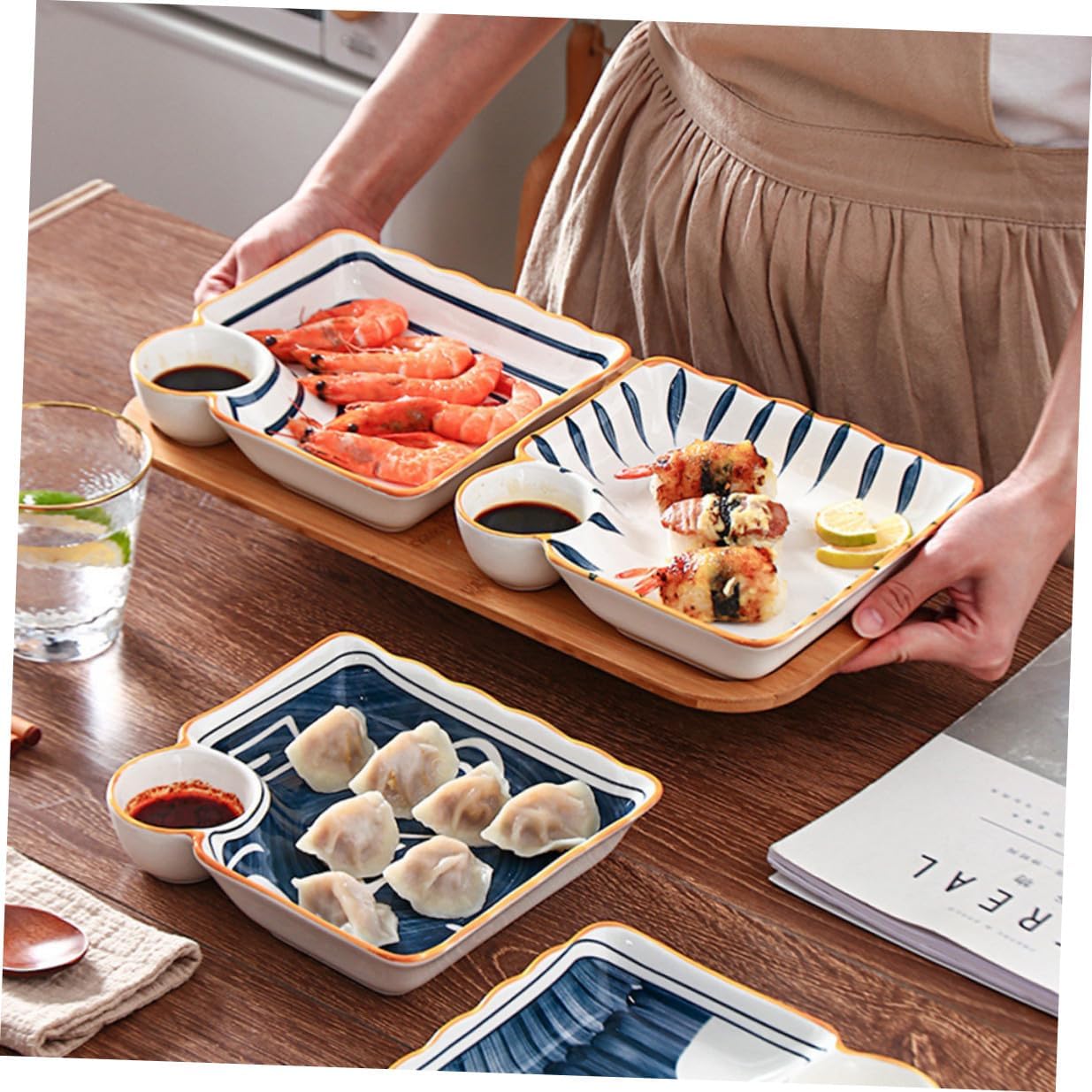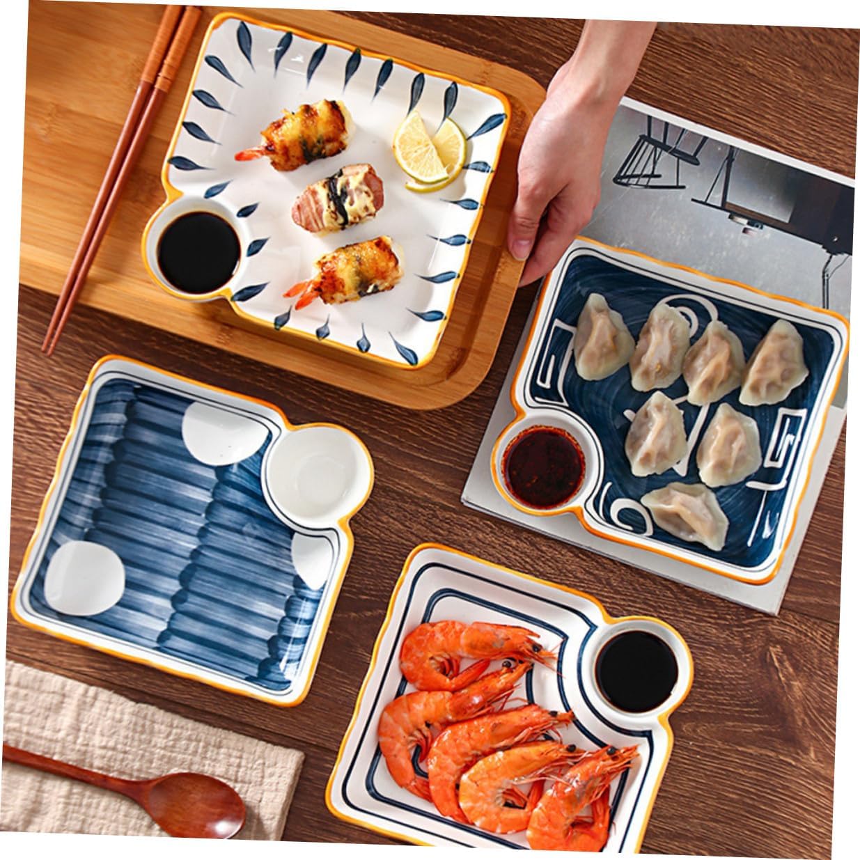 Package List 4 x Plates Characteristics -Product Info:Sushi dessert plate - Color: Assorted Color. - Material: Ceramics. - Size: 18.50X17.50X3.50cm/7.27X6.88X1.38in. - Made of great quality material, it's and safe for use. - This creative multi-grid plate is very suitable to be used for three meals or snacks reusable small serving plates. - It can be used as a Western food plate wonderfully, which can increase your appetite well square container. - The bottom of the plate adopts a unique design, placed on the table is not easy to slid, very safe plate with dipping bowl. - This dish is not only suitable for hotel use, but also suitable for home use, compact appearance, is a beautiful home furnishings side dish bowls.Goods Descriptionjapanese dipping bowls The unique design and craftsmanship its popularity and practicality.plate for dumpling strong and sturdy.sashimi serving platter It is very convenient to use, and the two-zone design is very practical.japanese cuisine plate This food plate is made of safe and ceramics, and beautiful, practical and .sashimi serving dish The design is simple, and the surface is smooth without burrs.sushi dipping tray plate The ceramic material has a texture