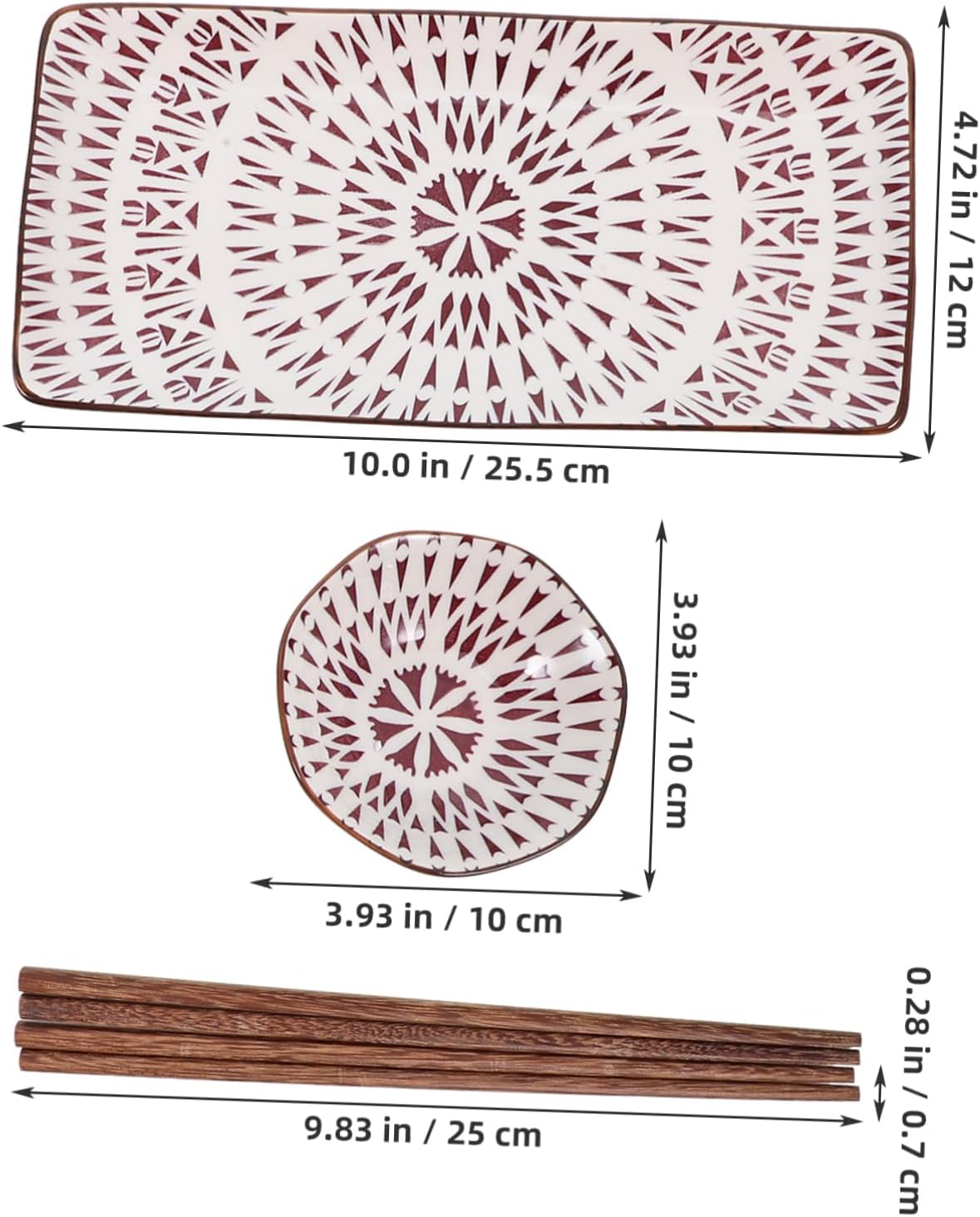 Package Include 2 x plates 2 x dishes 2 x pairs of chopsticks Features - Size: 10.00X10.00X3.00cm/3.93X3.93X1.18in (dish) Ceramic Serving Dish - Size: 25.00X0.70X0.70cm/9.82X0.28X0.28in (chopsticks) Ceramic Serving Plate - Material:Ceramic, wood Ceramic Appetizer Plates - Color: Multi-color Sushi Serving Plate - Size: 25.50X12.00X2.50cm/10.02X4.72X0.98in (plate) Ceramic Sushi Dish - Characteristic and , this serving plate is simple and generous, smooth in lines Salmon - A great and stylish addition to food presentation, which increase appetite and have a mood Ceramic Food - The proper size Japanese Food Plate for you, so that it fits all the snacks and foods you like Japanese Sushi Serving Dish. - food serving plate, suitable for family gathering, party, restaurant, catering, etc Multi-function Sushi Plate - These ceramic plates and dishes featuring unique pattern for a enjoyable Sashimi Serving Goods DescriptionPractical Sushi Plate Suitable for restaurants, hotels, special parties and family dinners.Japanese Style Sushi Plate This is a sushi plate, very convenient and practical to use, which is practical for serving sushi.Japanese Sushi Plates The sushi plate has a simple design, but very practical in use, bringing much convenience to you