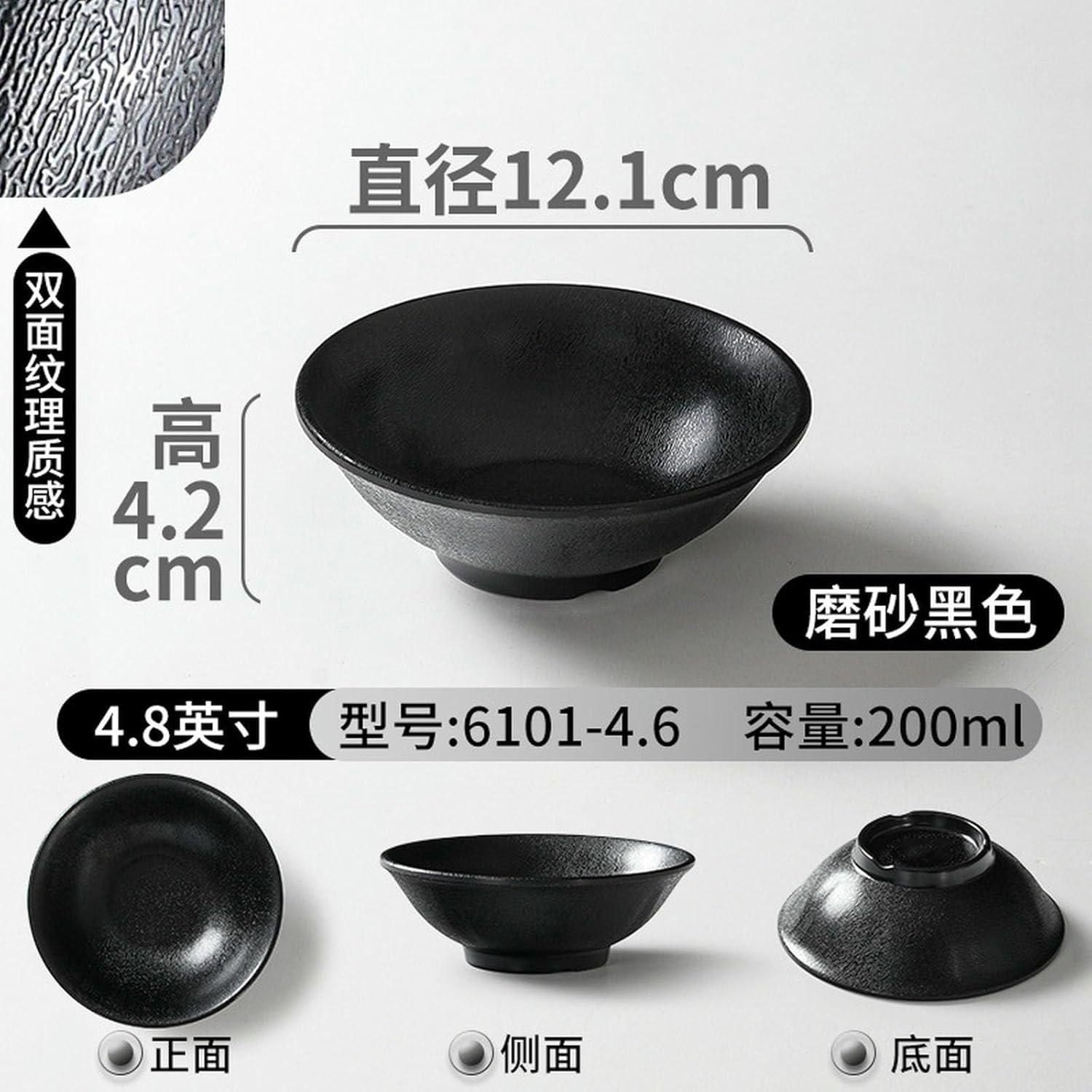 Product Category: Bowl, Dish, Plate Set Material: Melamine Pattern: Solid Color Style: Chinese Shape: Round Color: 6101-4.6 Matte Black -4.8 inch Small Bowl, 6101-5.2 Matte Black -5.2 inch Small Bowl, 6101-5.6 Matte Black -5.6 inch Small Bowl, 6101-6 Matte Black -6 inch Small Bowl, 6101-6.4 Matte Black -6.4 inch Small Bowl, 6101-6.8 Matte Black -6.8 inch Small Bowl, 6102-5 Matte Black -5 inch Small Bowl, 6102-5.4 Matte Black -5.4 inch Small Bowl, 6102-5.8 Matte Black -5.8 inch Small Bowl, 6102-6.2 Matte Black -6.1 inch Small Bowl, 6102-6.6 Matte Black -6.6 inch Small Bowl, 6102- 7 matte black - 7 inch small bowl