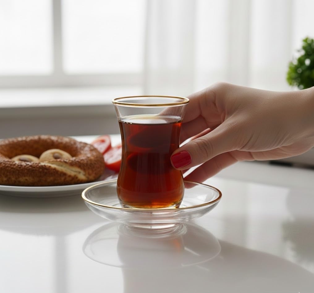 BEAUTIFUL DESIGN: Elegant gold details combine with beautiful tulip-shaped lines to deliver a gorgeous cup that will look great on your table. The crystal clear transparent glass allows you to see the contents of your cup, so you can brew the tea exactly to your taste. NOT JUST FOR TEA: They're called teacups, but they're much more versatile than that. Use these gorgeous little glasses for espresso, wine and whiskey tasting, small portions of water and juice INCLUDES 6 CUPS AND 6 PLATES: Invite a few friends and enjoy an authentic coffee break together; With service for six, there will be plenty of cups and saucers to go around. MADE IN TURKEY: Because authentic Turkish tea should be drunk in an authentic Turkish cup. It just feels right! The traditionally shaped Arabic teacup is shaped just right for a comfortable grip. GREAT GIFT IDEA: When you want to give a gift that is unique and useful at the same time, these Turkish tea cups will be the way to go. The perfect gift for Christmas, housewarming, bridal shower, wedding, birthday or “just because.”
