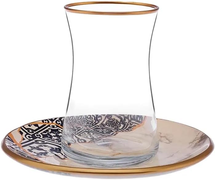 Karaca Aris 12 Piece Glass Turkish Tea Set combines functionality with artistic flair, making it an ideal addition to any home. The Turkish tea set includes six 150ml clear glass tea cups, perfectly sized for a traditional Turkish tea serving, and six unique 13.5cm saucers. Each saucer showcases a captivating blend of black and white traditional patterns alongside a contemporary marble-effect design, all elegantly outlined with a shimmering gold trim. This thoughtful combination of classic and modern elements ensures that the set stands out, adding a touch of sophistication to your table. Crafted from quality glass, both the cups and saucers are durable and designed for regular enjoyment. The transparent glasses allow you to appreciate the vibrant color of your tea, enhancing the overall sensory experience. Whether you're hosting guests, enjoying a quiet afternoon, or simply looking to infuse your home with a touch of Turkish elegance, Karaca Aris tea glasses set is an ideal choice. To maintain the intricate designs and preserve the longevity of your set, hand washing is recommended.