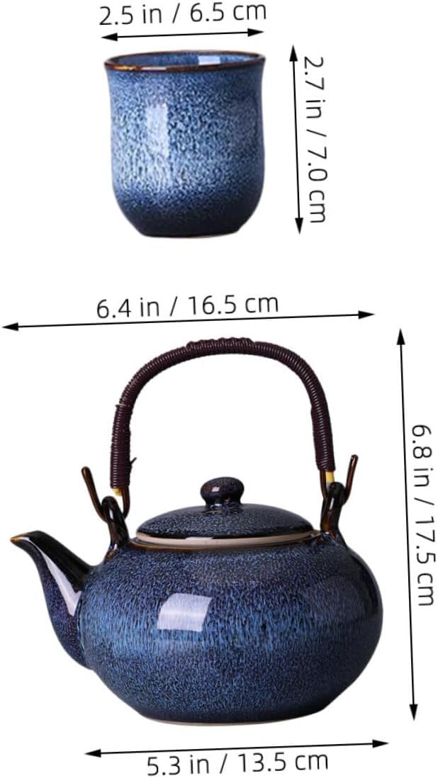 Package List 1 x teapot 6 x cups Characteristics -Easy-to-hold handle: the handle design allows for comfortable lifting and pouring, even when the teapot is full, preventing burns porcelain japanese tea cups -Large teapot capacity: the large capacity of the teapot is perfect for sharing with multiple people, ideal for family gatherings or office breaks ceramic tea pot and cup -Size:7.00X6.50X6.50cm/2.75X2.55X2.55in -Product Info:Beam-lifting pot tea set -Color:Blue -Size:17.50X16.50X13.50cm/6.88X6.48X5.31in -Teapot capacity: about 800ml. -Complete kung fu tea set: this set includes teapot and several cups, providing a complete setup for a full tea ceremony without needing additional accessories -excellent ceramic material: crafted from excellent ceramic, this tea set is resistant to high temperatures and breakage -Teacup capacity: about 130ml. -Unique artistic glaze: the unique artistic glaze on each piece makes every tea set a masterpiece, enhancing your tea experience -Material:CeramicGoods Informationceramic teapot and mug Whether used for daily tea rituals or special occasions, this set elevates the tea-drinking experience with its timeless charm.ceramic chinese teapot The teapot's generous capacity and the accompanying cups make it suitable for serving multiple guests, while its traditional design adds a touch of sophistication to any setting