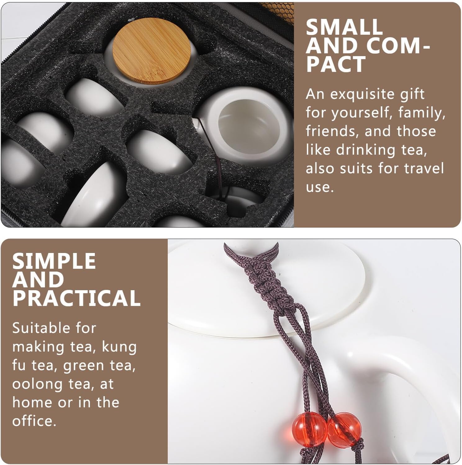 Package Include 1 x storage bag 1 1 x teapot 1 x tea jar 6 x tea cup 1 x clip 1 x cleaning cloth Characteristics -Size:23.50X23.00X11.00cm/9.24X9.04X4.32in(storage bag) -Size:17.50X2.60X1.70cm/6.88X1.02X0.67in(clip) -Size:8.50X8.50X7.50cm/3.34X3.34X2.95in(tea jar) -Size:12.50X8.50X8.00cm/4.91X3.34X3.14in(teapot) -Size:19.50X19.00X0.20cm/7.66X7.47X0.08in(cleaning cloth) -Material:Ceramic, leather, -Size:20.30X20.30X2.20cm/7.98X7.98X0.86in(tray) -Color:White -Product Info:Portable tea set -Size:6.10X6.10X3.00cm/2.40X2.40X1.18in(tea cup) - A good selection for those who like making tea and drinking tea, they will be happy for that ceramic pot. - Fine workmanship, polished surface, excellent production process, convenient and practical travel teapot teacup kit. - Equipped with travel bag, easy to carry, outdoor, business or travel, easy to carry, enjoy afternoon tea time chinese ceramic teacups. - Wide uses, the tea cup and teapot set is great for loose-leaf tea, blooming teas, kung fu tea, teabags and fruit tea fancy tea cups. - Creative design and bright color makes a person shine at the moment, .Goods Descriptionceramic tea cup The teapot and tea cups are made of , which is heat-resistant and easy to clean.portable ceramic tea pot This set of tea set with storage bag is portable, perfect for travel, camping, hiking, and other occasions.ceramic pot The practical and portable tea set is a perfect for your families or friends who love drinking tea