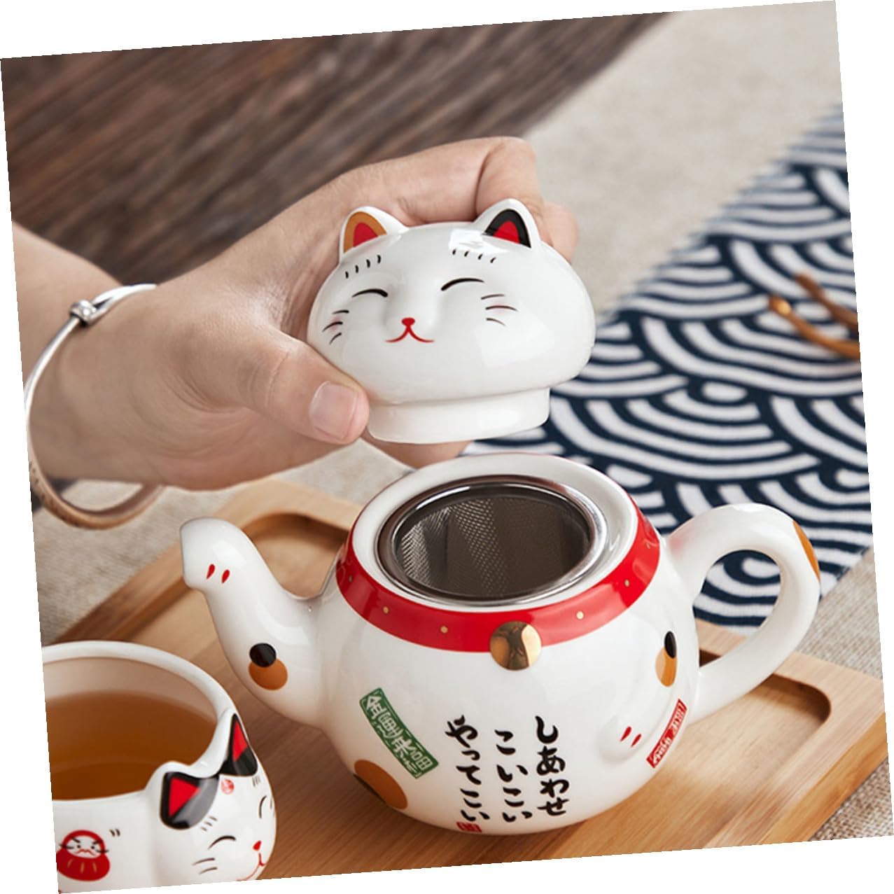 Package List 1 x teapot 2 x tea cup Characteristics -Size:16.00X11.80X7.00cm,/6.29X4.64X2.75in; 12.50X7.00X7.00cm/4.91X2.75X2.75in -Product Info:The lucky cat tea set -Color:Assorted Color -Material:Ceramic - It is very easy to use, simple and generous shape, showing elegant taste tea kit. - Adoption of high-grade and safe material, premium texture, and practical. - The excellent workmanship of our teapot and teacup will bring you a Ceramic Tea Cup. - With a smooth surface, this tea making pot looks elegant and beautiful. - It is easy and convenient to clean, and easy to store when not in use.Goods InformationCeramic Teaware It is made with excellent craftsmanship and has excellent durability.tea kit It will be your good choice.tea pots It has a reasonable design and practical functions, which can well meet your daily tea making needs and help you make more delicious tea.Household Tea Ware This product is a set of teapot made of high-class ceramic material
